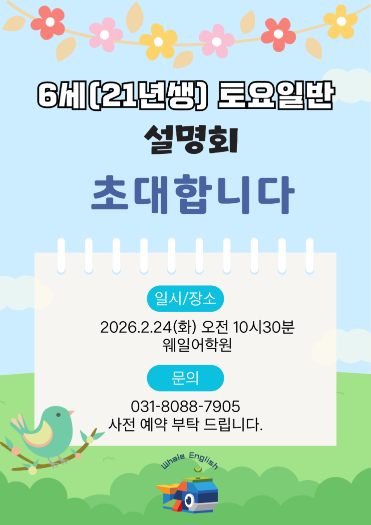 DARE TO BE DIFFERENT ! 안녕하세요 ^———-^ 동탄 유치 초등 영어 전문 웨일 어학원입니다. 학부모 설명회 안내 6세 토요일 영어 수업 2021년생 6세 대상 토요일 영어 수업 학부모 설명회에 초대합니다. 이번 설명회는 수업이 어떻게 진행되는지, 그리고 이 수업이 아이에게 맞는 수업인지를 직접 확인하실 수 있는 자리입니다. 학부모 설명회 일정 일시: 2월 24일 (화) 오전 10시 30분 장소: 동탄 유치초등 영어 전문학원, 웨일 어학원 ※ 사전 예약 필수 토요일 6세반 수업 안내 • 개강일: 3월 7일 • 수업 시간: 토요일 오전 10:00 – 12:00 • 대상 연령: 6세 (2021년생) 본 수업은 아이가 영어를 처음부터 차근차근 쌓아갈....... <img src="https://blogthumb.pstatic.net/MjAyNjAyMDlfMTUw/MDAxNzcwNjI1MDQwOTA5.4JThE8X6PoKBjnK7-nfBtz1OckrqOTvUIRDuR-SR3Lgg.apK6SrpvqduuXF-W4YWjAXDEg9GeymuN8T3OgBofTpsg.PNG/900%A3%DF1770620611252.png?type=s3" />