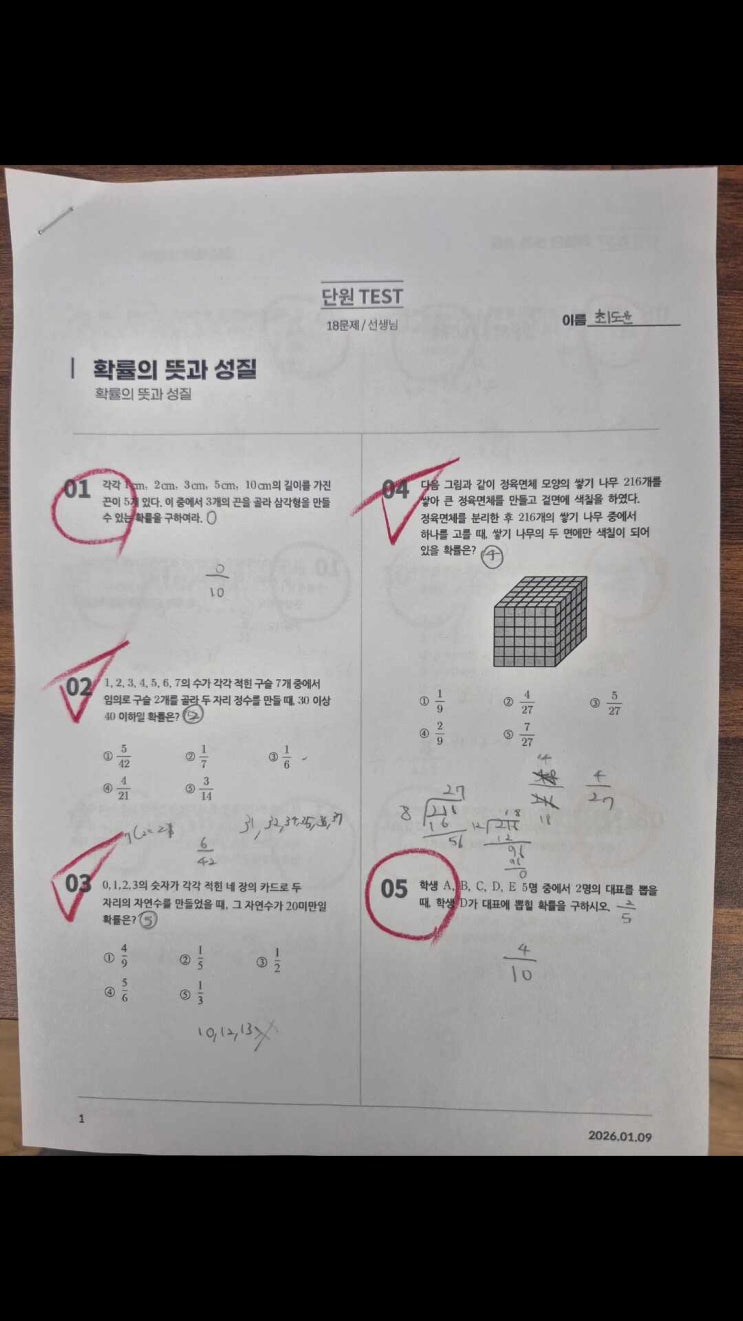 울 아들 수학 시험지(예비초5, 중2-2 확률)