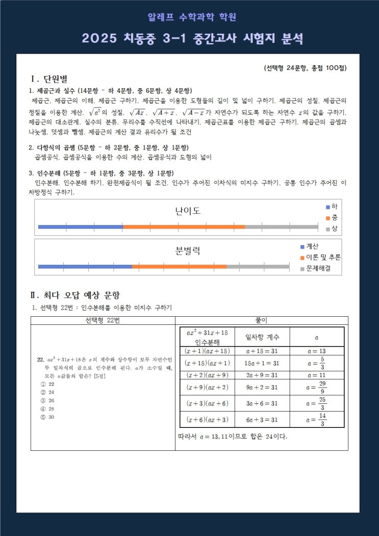 2025 치동중 수학, 시험 데이터 메타분석 및 필승 전략 안녕하세요, 동탄 수학학원 알레프 수학학원입니다. 우리아이는 학원도 열심히 다니고 문제집도 여러권 풀었는데 왜? 많은 학부모님께서 "우리 아이는 학원도 열심히 다니고 문제집도 여러 권 풀었는데, 왜 치동중 시험만 보면 실수를 할까요?" 라고 묻습니다. 오늘은 단순한 '공부량'이 아니라 학교 시험의 '결'을 읽는 메타분석을 함께 해보려고 합니다. 알레프가 분석한 2025년 치동중 1, 3학년 시험 데이터와 고등 선행 전문가의 조언을 결합하여, 치동중 수학의 핵심 승부처를 공개합니다. 1. 치동중 수학 내신 메타분석 (학년별 비교) 치동중 시험의 특....... <img src="https://blogthumb.pstatic.net/MjAyNjAxMDZfNDgg/MDAxNzY3NjY2MDE0NzMy.Otpqq7mclIai3EZePulisuDL99MRXIiFAEkO4blrKUcg.vfsLjxSylbnbXVefkePOhxTgLTz9BU9wRtzPLIm_xWkg.JPEG/%C4%A1%B5%BF%C1%DF3-1%C1%DF%B0%A32025%BC%F6%C7%D0001.jpg?type=s3" />