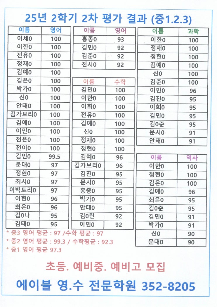 안녕하세요. 에이블 영수 전문학원입니다. 25년 2학기 2차 평가 결과 입니다. 저희 학원에는 화성중, 발안중, 상신중 학생들이 다니고 있는데 모두들 열심히 해주어서 좋은 결과가 나왔습니다. 기본적으로 평균이 95~96점대가 나오는데 이번 시험은 다들 더 열심히 해서 훨씬 높은 점수가 나왔네요. 저희 학원에 다니는 친구들은 대부분이 제암초등학교 출신이고 저희 학원에서 초등 저학년부터 기초를 탄탄히 쌓아온 친구들이라 중학교 영어 시험이 그렇게 어렵게 느껴지지 않을 겁니다. 자녀분이 더 높은 실력을 쌓고 싶거나, 기초가 부족하다고 느끼시면 저희 학원에 맡겨 보시기 바랍니다. 확실한 결과를 보여드리겠습니다. <img src="https://blogthumb.pstatic.net/MjAyNTEyMjNfODEg/MDAxNzY2NDczNjk1NzQ1.Gl6ewZ4xmMxbFjIiOHFq_dafkH8KuMQWhO9i2ktYpOsg.ISDGusgUfpMMmvjljAZzEBqef4rwdg8_RaBZkR3ca6sg.JPEG/hong.jpg?type=s3" />