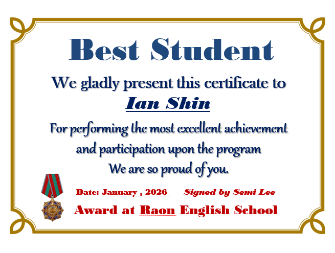 태전동, 장지동, 중대동 라온영어학원에서 2026년 1월 Best Student 소개해 드립니다.