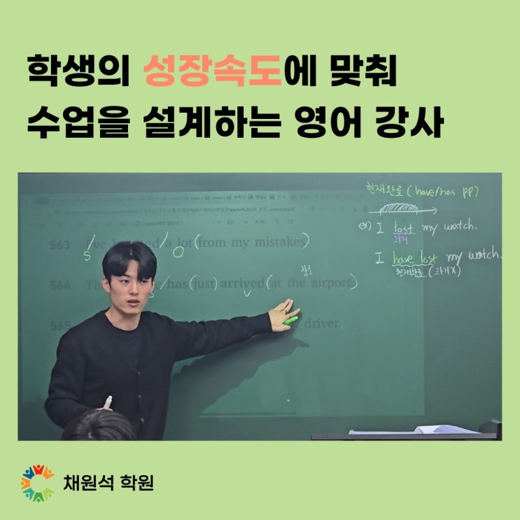 안녕하세요. 채원석학원에서 영어를 가르치고 있는 강사 김현수 입니다. 좋은 영어 수업이란 양으로 채우는 시간이 아니라 이해를 쌓아가는 수업이라고 생각합니다. 영어는 한 단계씩 쌓아 올리는 과목입니다. 기초가 약한 채로 문제만 많이 풀면 흔들리고, 너무 쉬운 수업만 반복하면 성장은 멈춥니다. 그래서 저는 수업을 할 때 항상 “이 학생에게 지금 필요한 단계는 무엇인가”를 먼저 고민합니다. 제 수업의 기준은 단순합니다. 학생 눈높이에 맞춘다는 것은 난이도를 낮춘다는 뜻이 아니라, ‘이해할 수 있도록 구조를 재정리해 준다’는 의미라고 생각합니다. 문장이 길어서 못 읽는 학생에게는 구조를 잘라 읽는 법을 먼저 가르칩니다. ....... <img src="https://blogthumb.pstatic.net/MjAyNjAyMTlfMTk3/MDAxNzcxNTAzOTE3NjM4.ZfwhCHY6_jWy4lPu8d5dAUF5J8MGF8d6qrfpcxFrTQkg.7igKpOdHLv97wsuUdwd0gleOMxnKktu5Upw8Sjsu_Ysg.JPEG/%C3%A4%BF%F8%BC%AE_%C7%D0%BF%F8_%BB%E7%C1%F8_20260219_1.jpg?type=s3" />
