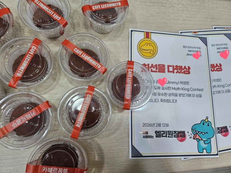 오늘은 지난번에 실시했던 엘리 Math King Contest 의 결과 발표를 해드릴게요. 엘리 수학킹 컨테스트에서는 ✔ 두개의 단원을 중심으로 구성된 서술형 문제풀이 ✔ 정답뿐이 아닌 풀이과정과 사고력을 함께 평가 ✔현재 학습 이해도와 서술형 대응력을 점검했어요. 그리하여, 면밀하고 세심한 분석을 통해, 초등부 5명, 중등부 5명 ⭐️ 총 10명을 선정하여 상장 수여와 "왕 두쫀쿠"(왕 두바이 쫀득쿠키)를 함께 증정했습니다. wow 초등부 1등 ~ 5등 중등부 1등 ~ 5등 총 10명의 시상식을 공개합니다✨️ 초등부 1등. Jimmy 2등. Jarry 3등. Jake 4등. Oliver 5등. Laura 중등부 1등.Harry 2등. Kate 3등. Dana ....... <img src="https://blogthumb.pstatic.net/MjAyNjAyMTVfMTYx/MDAxNzcxMTY0Mzc1MDI0.Oo9Xln7wqf9ywXMdocLIcwYSOMxdqtxfMBl-UTAtFCgg.i-w0dTwofcVCKVShP2m1pxmynLh9L-AYS0AM7BFRIdwg.JPEG/900%A3%DF20260212%A3%DF145238.jpg?type=s3" />