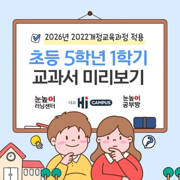 안녕하세요. 눈높이 경기광주입니다! 2026년부터 초등학교 5학년은 2022 개정 교육과정이 본격 적용되는데요. 단순 암기 중심 학습에서 벗어나 생각하고 질문하고 표현하는 힘을 기르는 방향으로 교과 내용과 수업 방식이 달라져요. 오늘은 경기광주hive에서 초등 5학년 1학기 교과서 미리보기와 과목별 공부 방향을 정리해 드릴게요! 2022 개정 교육과정의 핵심은 이해>활용>표현 입니다. 5학년부터는 학습 내용이 추상적, 개념적으로 깊어지고 스스로 생각을 말과 글로 정리하는 활동이 크게 늘어납니다. 지금부터의 준비가 매우 중요한 시기입니다. 5학년 국어는 시간 표현, 기행문, 비교,대조,열거, 비유 등 새롭고 낯선 개념을 많이 접....... <img src="https://blogthumb.pstatic.net/MjAyNjAxMDJfNDUg/MDAxNzY3MzI4MzY1MzI5.47_zctAobvc1Ait2rQ7dYe7qWQOVlcVLCEKz6O-OBfAg.H2ESvkvd97oZL1DYIv78Exws4wNsRChpvRx7VNnUzC0g.JPEG/KakaoTalk_20251222_182013502.jpg?type=s3" />