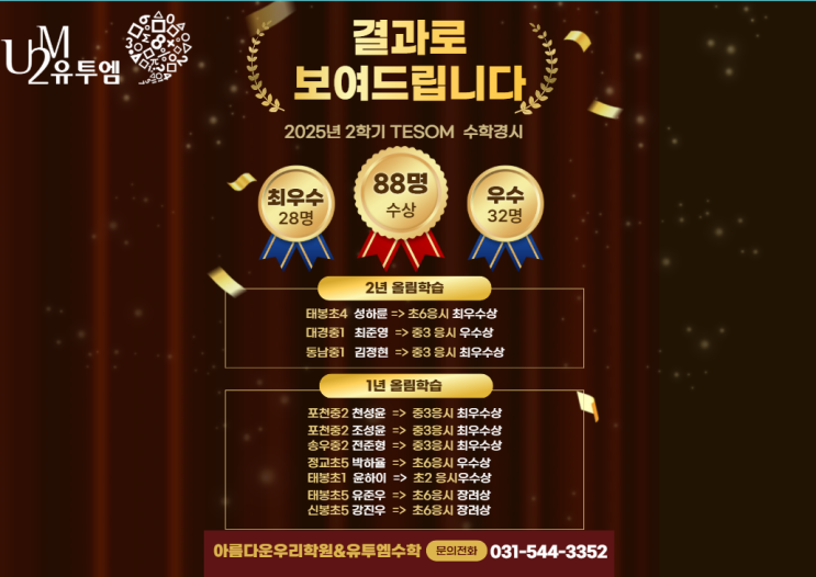 우리아이의 수학 잠재력, 어디까지 끌어올릴수 있을까요? 초등학생이 중등 시험에서 최우수상을 받고, 중학교 2학년이 고1 모의고사에서 2등급을 받습니다. 이것이 바로 아름다운우리학원&유투엠수학 학원 '꼼꼼한 선행'의 힘입니다. 2025 TESOM 수학경시 총 '88명' 수상! 뛰어난 학생의 의지와 완벽한 관리 시스템이 만나면 결과는 달라집니다. 우리 아이를 더 큰 무대에서 빛나게 할 '결과를 만드는 학원'과 지금 바로 시작하십시오. 수학 선행, 진도만 나가고 계십니까? 진짜 실력은 '압도적인 결과'로 증명해야 합니다. 2025년 2학기 TESOM 수학경시 무려 '88명' 수상 쾌거....... <img src="https://blogthumb.pstatic.net/MjAyNjAyMTlfMjc4/MDAxNzcxNDgwOTUxOTk5.8IvEp453TY6TVCaZdmQtm4czCKtKcJKt_3NHDIYFLe4g.yE-WYZon2rvhnBPuw7Toocn4CpRdqnvIm_0DncJk0MMg.PNG/image.png?type=s3" />