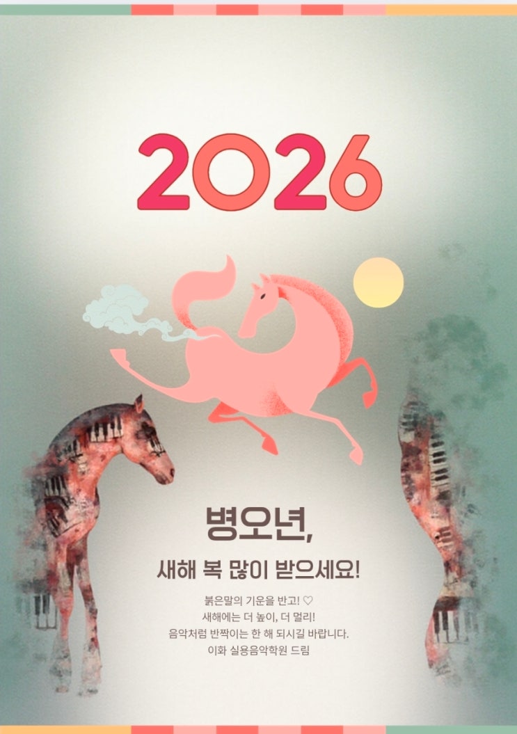 2026 丙午年, 붉은 말의 기운을 받으세요! ♡ 새해에는 더 높이, 더 멀리! 음악처럼 반짝이는 한 해 되시길 바랍니다. - 이화실용음악학원 - #2026년 #병오년 #붉은말의해 #새해인사 #새해덕담 #이화실용음악학원 #실용음악 #음악학원 #음악처럼반짝이는 #새로운시작 #꿈을향해 #도약의해 #희망찬새해 #음악레슨 #보컬레슨 #악기레슨 #화이팅 <img src="https://blogthumb.pstatic.net/MjAyNTEyMjlfNjAg/MDAxNzY2OTk3NzIwMjQw.pU8lJiecq4ym-0MkPHNwslV5hA__z-uvX28-LGO5d0kg.0jdDqGKEQeS3WAstJVJ3LQ7bv_tA6bKPuAJhrG7Ma4Eg.JPEG/900%A3%DFScreenshot%A3%DF20251229%A3%DF150515%A3%DFCanva.jpg?type=s3" />
