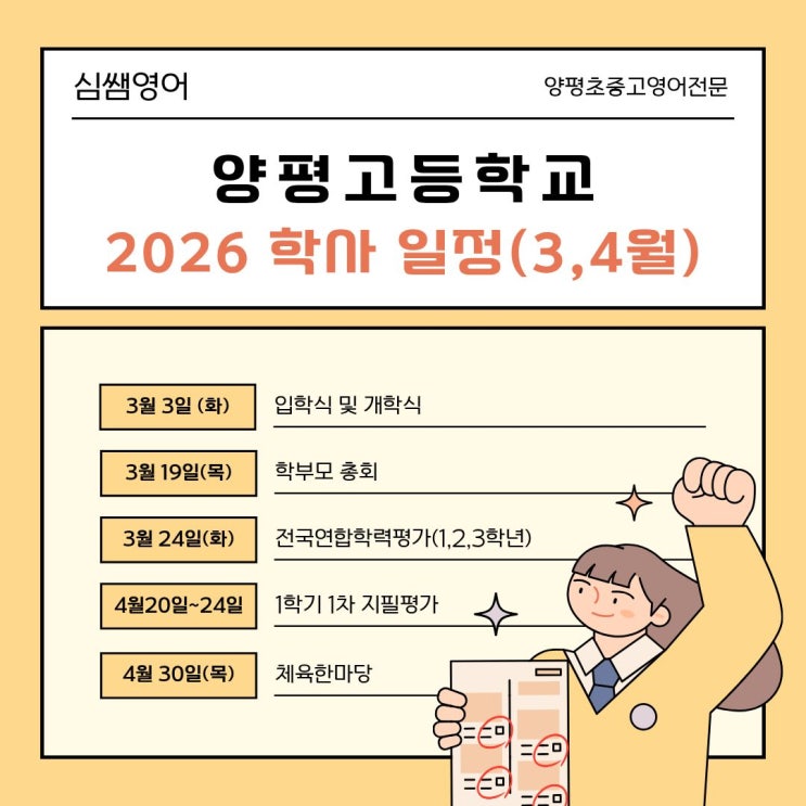 안녕하세요, 학생들의 "구멍난 영어 학습법"을 꼼꼼하게 꿰매고 있는 심쌤 입니다. 영원할 것(?)만 같았던 겨울 방학이 끝나고 이제 <2026년 입학과 개학>을 며칠 앞두고 있습니다. 우리 학생들 힘차게 새 출발을 할 준비가 되었나요? *^^* 무엇보다도 올해의 학교 일정이 어떻게 되는지 가장 궁금할텐데요, 오늘은 <2026학년도 양평고등학교의 학사 일정>을 알아보겠습니다. 3,4월 3월에는 첫 모의고사가, 4월에는 1학기 첫 지필평가가 예정돼 있습니다. 새내기 1학년 학생들에게는 입학 후 처음 치르는 시험이기 때문에 "설렘반, 걱정반"일텐데요, 겨울방학 동안 성실하게 공부했다면 만족스러운 결과가 있을....... <img src="https://blogthumb.pstatic.net/MjAyNjAyMjZfMjU1/MDAxNzcyMTE0NDY4Nzk4.3e1hTxZvcVMcMqszNXt4Nh3kQkmgN0uJR-nsJM8Gll8g.coSVtKz19tivXV6Y9lUeoor-M113L-_e3lOugQkHtG4g.JPEG/%BE%E7%C6%F2%B0%ED%C7%D0%BB%E73%2C4.jpg?type=s3" />