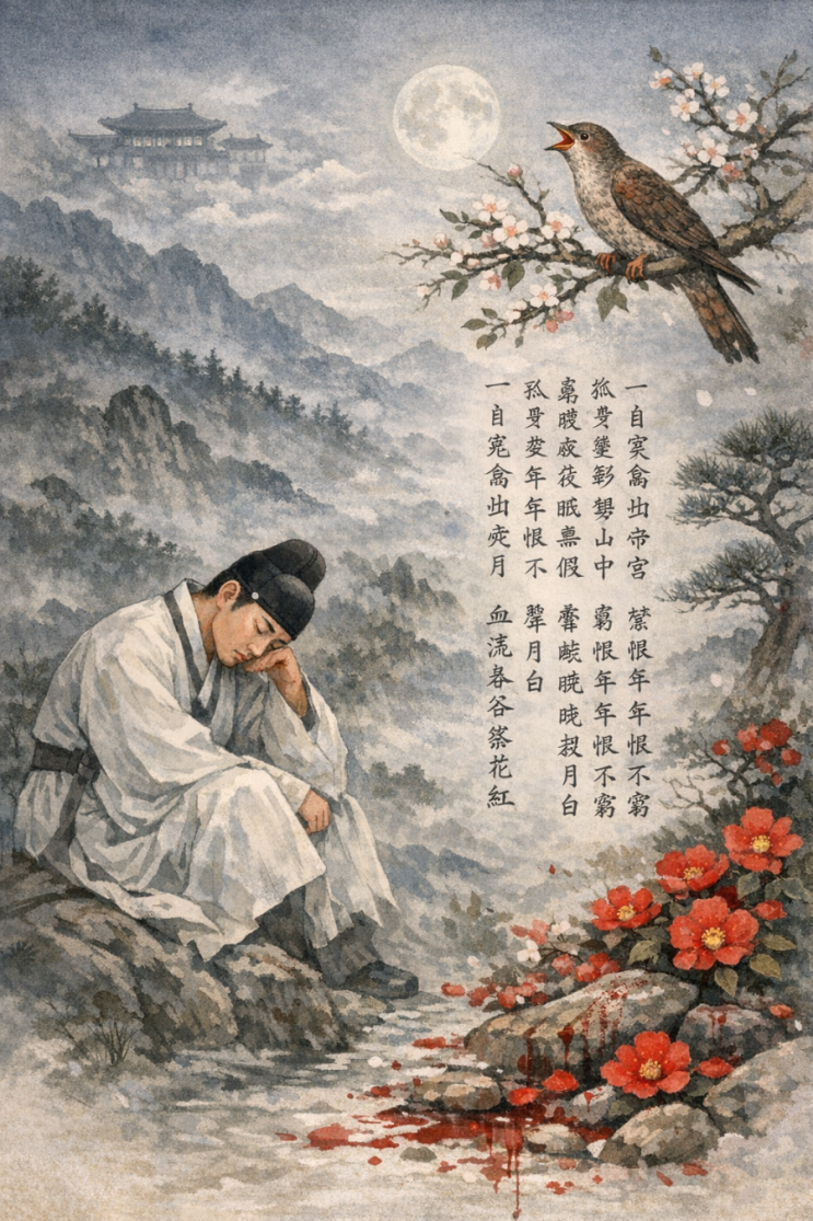 조선의 왕이었던 단종이 유배지 영월에서 지었다고 전해지는 자규시(子規詩)입니다. 처량한 자신의 모습을 두견새(자규)에 빗대어 표현한 시라고 하네요. 도서 <단종애사>를 읽는 중에 시 한 구절을 먼저 읊조려 봅니다. 자규시 (子規詩) 一自寃禽出帝宮 孤身隻影碧山中 假眠夜夜眠無假 窮恨年年恨不窮 聲斷曉岑殘月白 血流春谷落花紅 天聾尙未聞哀訴 何奈愁人耳獨聰 억울한 새가 되어 궁궐을 떠난 뒤 외로운 몸과 그림자만 푸른 산속에 있구나. 밤마다 잠든 듯하지만 참으로 잠들지 못하고 해마다 한이 쌓여도 그 한은 끝이 없구나. 새벽 산에 울음이 끊어지니 달빛만 희고 피맺힌 울음은 봄 골짜기의 붉은 꽃처럼 흐른다. 하늘은 귀가 멀....... <img src="https://blogthumb.pstatic.net/MjAyNjAzMTZfMTEg/MDAxNzczNjMyNTc0MzA2.o5EYLyZz5sPsnBQT7ynEd4Uf7fmT_FTnJCW5Uvewbcwg.1k2D2WuTr9RovmfyrvCATjp0L-cL7MnnyCZddVwyzIUg.PNG/900%A3%DFfile%A3%DF000000003a2471f89de1c77183b9163e.png?type=s3" />