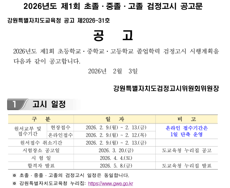 [춘천한양검정고시학원] 2026년도 제1회 초졸,중졸,고졸 검정고시 공고문