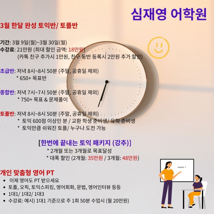 <3월 프로그램 한눈에 보기> 1. 3월 한달완성 토익 졍규반 (저녁) : 스테디 셀러 ㅎㅎ, 선생님들의 열강 직관^^ 2. 토플준비반: 누구나 도전 가능한 쉬워진 토플, 유학 준비생, 교환학생 준비생 대환영!!! 3. 한번에 끝내는 토익 패키지 : 2달이나 3달로 목표점수 달성 계획이라면 패키지를 선택하는 센스로 비용 절약 (인기 폭발***) 4. 개인 맞춤형 영어PT : 나만의 맞춤 수업, 나만의 선생님, 토익이외에도 토플, 오픽, 토스, 회화 등 선택 꿀팁 1 : 정규반은 카톡 친구추가시 1만원 할인 혜택 있습니다. 꿀팁 2: 친구 동반 수강 신청시 2만원 할인 혜택 있습니다. 꿀팁 3: 패키지 프로그램 신청시 대폭 할인혜택 들어갑니다. 토익 이외....... <img src="https://blogthumb.pstatic.net/MjAyNjAyMTBfNzgg/MDAxNzcwNzAwMDgxODMx.m8EXcS71VdiPxsaBoSzE_gkzNMkA9rp-vtBQ9bWqB4Qg.VMg0M_JYQyB1AzkZToeRFhU1y7uJdpprpp4HOxKPs34g.JPEG/3%BF%F9.jpg?type=s3" />