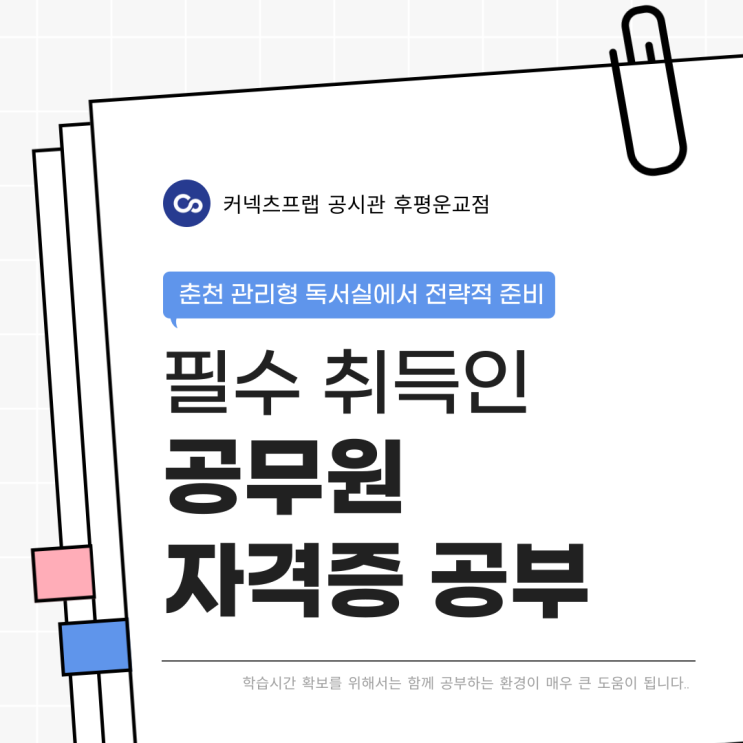 춘천 관리형 독서실 공무원 필수 자격증 안녕하세요 날이 많이 추워지고있죠~ 추운 겨울날 실내에서 따뜻하게 공부하면서 자격증을 취득해보시는건 어떨까요? 취준생 시기 면접 시 인정받는 2년 유효 자격증은 지금 바로 준비해야 합니다. 따뜻한 히터 아래 쾌적한 공부 환경에서 자격증을 준비해보시는 건 어떠실까요? 커넥츠프랩 공시관 후평운교점은 단순한 자습 공간을 넘어, 공시생들을 위한 맞춤형 집중 환경과 진짜 관리 시스템을 제공합니다. 시험을 준비하며 전공 뿐만 아니라 어떠한 공부를 해야하는 지 놓친 건 없는지 살펴보셔야 하시는데요 그중 자격증은 공시생이라면 "선택"이 아닌 "필수" 조건입니다. 시험....... <img src="https://blogthumb.pstatic.net/MjAyNTEyMjlfNiAg/MDAxNzY2OTc5MzkyNTMz.klOfXqK33mjgUTMj01OmX9JM883hvBXCZZLjIsNZ1kcg.quSZe0K3m9tIdng4PuHvuFscncXRgSJ1VRe1UIycvpkg.PNG/001.png?type=s3" />