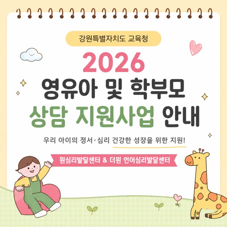 안녕하세요~ 원주시 언어치료, 심리치료 전문 기관인 원심리발달센터 & 더원언어심리발달센터 입니다 환절기 날씨로 감기 증상을 보이는 아이들이 많은 요즘입니다. 우리 아이들과 보호자분들 모두 건강 유의하시길 바랄게요~ 오늘은 강원특별자치도교육청 유아교육원에서 운영하는 「2026 권역(지역)별 영유아 및 학부모(보호자) 상담 사업」에 대해 안내드리고자 합니다. 본 사업은 도내 어린이집 및 유치원에 재원 중인 만 3세~5세 영유아를 대상으로, 유아기 정서·심리 문제를 조기에 발견하고 예방적 개입을 통해 아이들이 보다 건강하게 성장하고 발달할 수 있도록 지원하는 사업입니다. (두루바른사회적협동조합에서 위탁 운영) 1....... <img src="https://blogthumb.pstatic.net/MjAyNjA0MjhfMjM4/MDAxNzc3MzYyMjg3NDc3.CeViXH1Wswgb9REO8pu8IWCtvaN48b2Zhc_5oWtZ-Lgg.ZysYCaEK7wDRguxZfBfcP2q98VmPnLdtTw9EP5UbxREg.PNG/ChatGPT_Image_2026%B3%E2_4%BF%F9_28%C0%CF_%BF%C0%C8%C4_04_43_17.png?type=s3" />