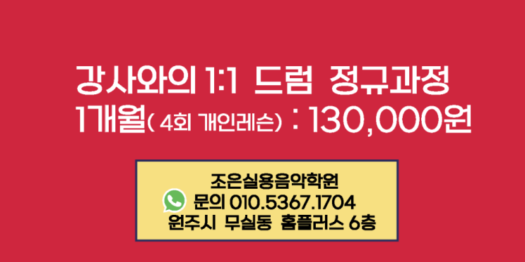 원주 성인 초보자를 위한 실전 드럼 입문 ( 1개월 - 4회 개인레슨 수강료 : 130,000원 )