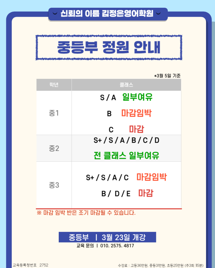 안녕하세요~ 신뢰의 이름 김정은 영어학원 입니다 :) 2026년 3월 5일자 기준으로 현재 중등부 정원 안내 드립니다! *마감임박반은 조기 마감될 수 있습니다! 중1 C클래스 마감! 중1 B클래스 마감 임박 중2 전 클래스 (S+, S, A, B, C, D) 일부 '여유' 중3 S+, S, A, C클래스 마감 임박 그외 클래스 (B, D, E) 마감 입니다! 교육 및 상담 문의 : 010.2575. 4817 교육 및 상담 문의는 연락처로 연락 남겨주시면 평일 오후 3시30분 이후 순차적으로 연락드리겠습니다. 감사합니다. 신뢰의이름김정은영어학원 *교육청등록번호 2752* 수강료 : 고등36만원, 중등31만원, 초등25만원 (주3회 115분씩) #어차피_영어는_김정은영어 #이....... <img src="https://blogthumb.pstatic.net/MjAyNjAzMDVfMjMw/MDAxNzcyNzE1NDc1NTI1.A1y6gLGUdhDhVlXyueVkJ_RTQeNYMBsPPq_Nwm9LHcAg.Dwvvfg4MPx41sIwP1cn1Oq3FEyy5UF5nDCbTowGASpsg.PNG/KakaoTalk_20260305_201055338.png?type=s3" />