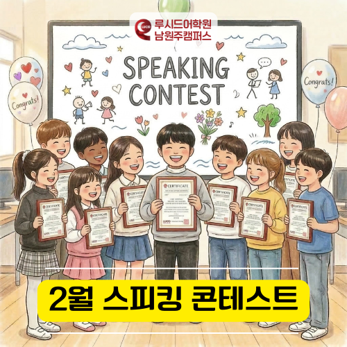 안녕하세요, 남원주 루시드 영어학원입니다~! 2월도 어김없이 진행된 스피킹 콘테스트! 아직은 옷깃을 여미게 되는 찬 바람이 머무는 3월이지만, 남원주 루시드 강의실만큼은 아이들의 목소리와 즐거움으로 열기가 가득했답니다. ---- 스피킹 콘테스트에 대한 자세한 내용은 아래 글을 확인해 주세요~! --- 매달 열리는 스피킹 콘테스트지만, 발표를 준비하며 반짝이는 아이들의 눈빛을 마주할 때면 매번 가슴 한구석이 뭉클하고 대견해집니다. 사실 친구들과 선생님 앞에서 발표할 그 짧은 시간을 위해 우리 아이들은 참 많은 정성을 쏟는답니다. 수업 시간에 배운 표현들을 하나하나 내 것으로 다시 정리하고, "선생님, 이 문장은 어떻게....... <img src="https://blogthumb.pstatic.net/MjAyNjAzMTZfMTEy/MDAxNzczNjMxNTg2NzE5.xSyhpVyrmAh6FMEOTuJrr6DvUvqh1rYaHx3PVSnWS2sg.Ban2NvDtXgWLS_bG-2Iz8PWO_0KLdvr6Vk3V1rAzNiMg.PNG/%B3%B2%BF%F8%C1%D6__20260316.png?type=s3" />