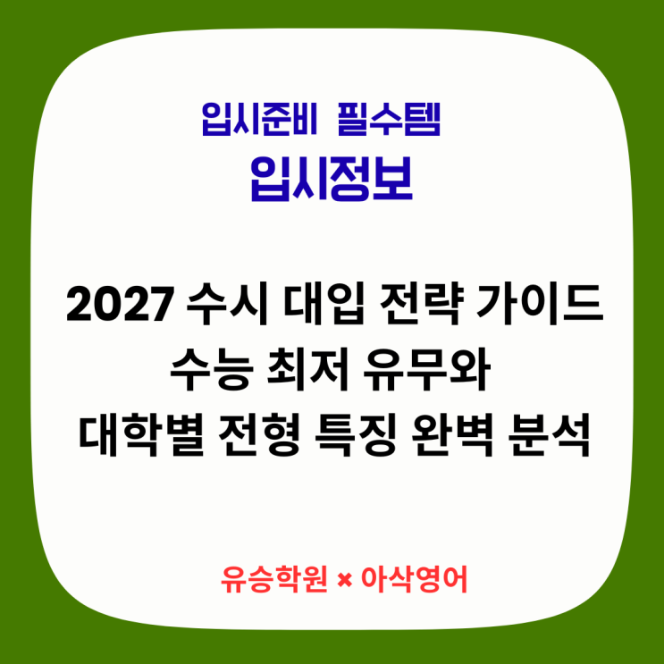 원주시 단구동에서 20년 넘게 국영수 학습을 지도하며 많은 학생들의 성장을 함께해 온 유승학원입니다. 유승학원은 수학·영어 전문 학원으로, 수학은 단계별 맞춤 수업, 영어는 아삭영어 원장님 직강 시스템을 통해 내신·모의고사 실력을 확실하게 끌어올립니다. 오늘은 충남교육청 진로교육원에서 발행한 「2027학년도 수시 대입정보 미리보기」를 바탕으로 내년도 입시의 핵심 지도를 그려보겠습니다. ① 수능 최저학력기준: 합격의 마지막 관문 2027학년도 수시에서도 수능 최저학력기준은 가장 강력한 변수입니다. ✔ 최저 있는 전형: 수도권 주요 대학 및 의약학 계열은 여전히 높은 수준의 최저 기준을 요구합니다. 내신이 좋아도 최....... <img src="https://blogthumb.pstatic.net/MjAyNjAyMjFfMjk5/MDAxNzcxNjc4OTA0NDU5.6OodiNgXSaM_MxuqBE30w3oAb85251TlWCRXPmdcyfkg.SFWpg1Cb0lALmlmWjt_PxBDC8cAZTPppJn6ya1NL5RAg.PNG/%28%C0%CE%BD%BA%C5%B8%B1%D7%B7%A5_%B0%D4%BD%C3%B9%B0%2845%29%29_%281080_x_1080_px%29_%281080_x_1080_px%29_%286%29.png?type=s3" />