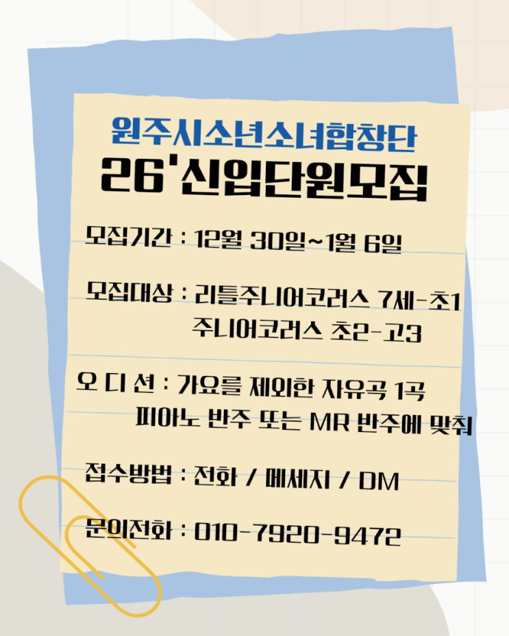 26년 원주시소년소녀합창단의 신입 단원 모집이 있습니다 ^^ 노래를 사랑하고 재능있는 친구들의 지원을 기다립니다!! #원주시소년소녀합창단 #원소소 #원주어린이합창단 #원주리틀주니어 #소년소녀합창단 #신입단원모집 #오디션 #26년신입단원 <img src="https://blogthumb.pstatic.net/MjAyNjAxMDFfMTM0/MDAxNzY3MjY5OTMxOTAz.hRRHEceihrx-rylPDNoxZqqLQDDm3e7U5wPKSILhgccg.JGnHTA3ynki22pqC59l7ZwkCIB0M58s6QMwVxg_8YlUg.PNG/900%A3%DF%B9%AB%C3%A4_%BC%F6%B0%AD%BB%FD_%B8%F0%C1%FD_%C0%CE%BD%BA%C5%B8%B1%D7%B7%A5_%B0%D4%BD%C3%B9%B0%A3%DF20251228%A3%DF165143%A3%DF0000.png?type=s3" />