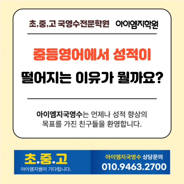 안녕하세요 아이엠지국영수학원입니다! 3월이 시작되었는데도 여전히 날씨가 춥고 바람이 많이 불고 있는 것 같습니다! 그래도 내일부터 3월 새 학기를 맞이하게 되는 것 같습니다! 초등학교 내내 영어 학원을 빠지지 않고 다니고 받아쓰기도 만점을 받아오던 아이가 중학교 첫 시험 결과표를 들고 왔을 때 점수를 보고 놀라셨던 경험이 있으신가요? 실제로 이런 상황을 처음 겪는 학부모님들은 '우리 아이가 분명 영어를 잘했는데'라며 몹시 당혹스러워하십니다. 이는 특별한 우리 아이만의 이야기가 아닙니다. 첫 중간고사 성적표를 받고 난 후에야 문제를 직감하는 가정이 예상보다 훨씬 많습니다. 중고등부 영어학습에 대한 준비를....... <img src="https://blogthumb.pstatic.net/MjAyNjAzMDJfMTEz/MDAxNzcyNDQzMjc0OTQz.Gps5EPDZU7swqeXcqstH_X4TwPDSQxjP40FpInAXIP8g.3xmrP9t3zKuxSoV6m6IkXU3NkDMC5e1VlsloWO_BfsMg.PNG/%BE%C6%C0%CC%BF%A5%C1%F6%C7%D0%BF%F8_%282%29.png?type=s3" />