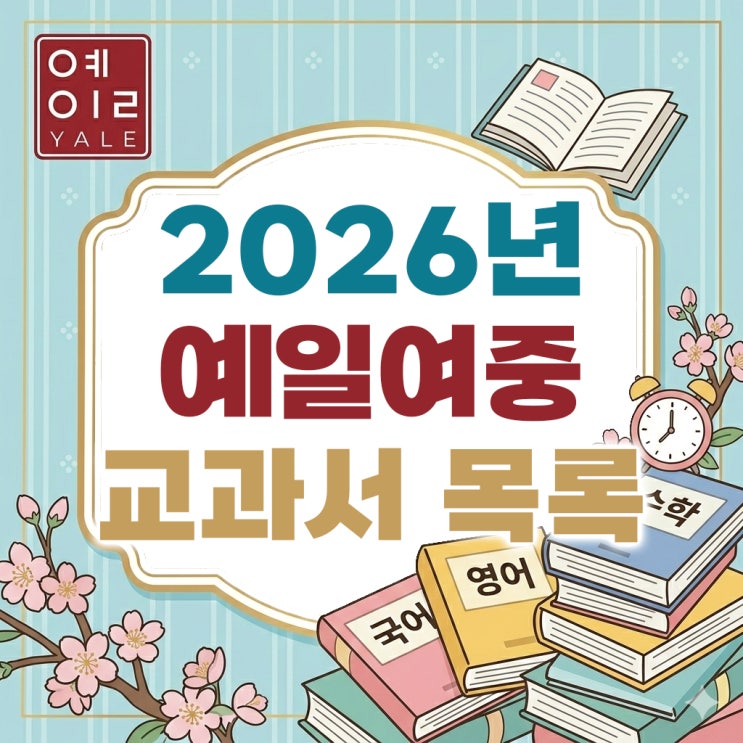 안녕하세요. 은평구영어학원 전문호영어학원입니다. 2026년 예일여자중학교 1학년, 2학년 학생들이 사용하게 될 2022년 개정 교과서 출판사 목록을 정리했습니다. 이 자료는 예일여자중학교에 공개된 정보를 편집한 것입니다. 더 자세하고 다양한 정보를 원하시는 분들은 아래 링크된 예일여중 홈페이지를 확인하시면 됩니다. ▽▽▽▽▽▽▽▽▽▽▽▽ 2026학년도 예일여자중학교 1학년 학생들이 사용하게 될 2022년 개정 교과서 목록입니다. 국어 1-1, 1-2 교과서는 비상교육 (박영민) 교과서를 사용할 예정입니다. 저희 학원에서 가장 관심을 갖고 보고 있는 영어 교과서는 동아출판이네요. 2026년 예일여중 1학년 영어 1 교과서 출판사는 동....... <img src="https://blogthumb.pstatic.net/MjAyNjAzMDJfMjcw/MDAxNzcyNDI4OTg0Njcz.t6SFDpNGM-CV8YJGVcPHvMY_ku0kANBznTvUfCFRs1kg.qZPioitH3d3Y2OxO19XrgMJOiYf6cCouMZT3vtkHyeEg.JPEG/2026%B3%E2_%BF%B9%C0%CF%BF%A9%C0%DA%C1%DF%C7%D0%B1%B3_%B1%B3%B0%FA%BC%AD_%C3%E2%C6%C7%BB%E7_%B8%F1%B7%CF_-_111.jpg?type=s3" />