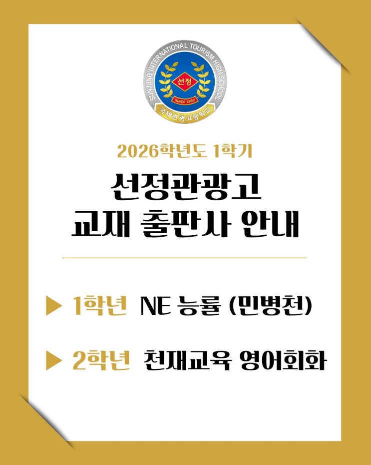 안녕하세요 비티와이 영어학원입니다. 2026학년도 1학기 선정관광고등학교 교재 출판사 안내드립니다^^ 1학년 : 능률 민병천 2학년 : 천재 영어회화 -BTY English- BTY 영어학원 전화 : 02 - 389 - 3971 BTY 영어학원 위치 : 서울시 은평구 갈현로 271 (북경원 2층) -학원등록번호 제 02201700082호- ❤️ 블로그 : https://blog.naver.com/btyenglish ❤️ 인스타그램 : https://www.instagram.com/btyenglish/ ❤️ 홈페이지 : https://btyenglish.modoo.at/ #갈현초영어학원 / #선일초영어학원 / #연광초영어학원 / #구현초영어학원 / #은진초영어학원 #연신초영어학원 #선일여중영어학원 / #대성중영어학원 / #선정중영어학원 / #예일여중영....... <img src="https://blogthumb.pstatic.net/MjAyNjAyMjZfMjE5/MDAxNzcyMDg3NjU5MjUx.ssE-6sPYnb0nBtn6IPwYovIiIdGTXtB8meg9edurqOUg.OlB6Cyu8jb5bObDgUHbn9dvvnGIMPyjoK9Ba2Xb6-c0g.JPEG/%B1%B3%C0%E7%C3%E2%C6%C7%BB%E7.jpg?type=s3" />