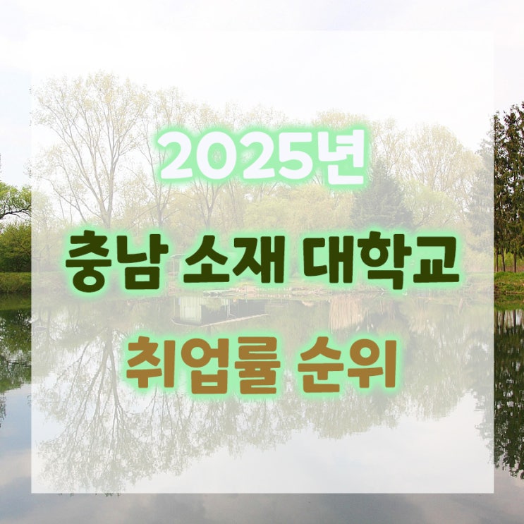 안녕하세요. 은평구영어학원 전문호영어학원입니다. 2025년 취업률 순위를 정리하고 있습니다. 오늘은 충청남도에 위치한 4년제 대학교들의 취업률을 올려보겠습니다. 이 자료는 대학 알리미에 공시된 정보를 편집한 것입니다. 더 자세하고 다양한 정보를 원하시면 아래 링크된 대학 알리미 홈페이지에서 확인하실 수 있습니다. ▽▽▽▽▽▽▽▽▽▽▽▽▽▽▽ 2025년 충청남도 소재 4년제 대학교들의 취업률입니다. 취업률이 가장 높은 대학교는 한국기술교육대학교입니다. 충청남도 천안시에 위치한 한국기술교육대학교의 취업률은 82.8%입니다. 두 번째로 높은 취업률을 보인 대학교는 충청남도 논산시에 위치한 건양대학교이며, 2025년 취업....... <img src="https://blogthumb.pstatic.net/MjAyNjAyMjZfNzQg/MDAxNzcyMTA2NjQwNzA4.Mh6hRgnHMFO7bzJX6em5ZVj5sV2srFBZEZQm-punPTcg.W4vi7Nyg7cIZXJveXCVXZb3-DdwEVVNpBlEmndug648g.JPEG/2025%B3%E2_%C3%EB%BE%F7%B7%FC_%BC%F8%C0%A7_-_%C3%E6%C3%BB%B3%B2%B5%B5_%BC%D2%C0%E7_%B4%EB%C7%D0%B1%B3_11.jpg?type=s3" />