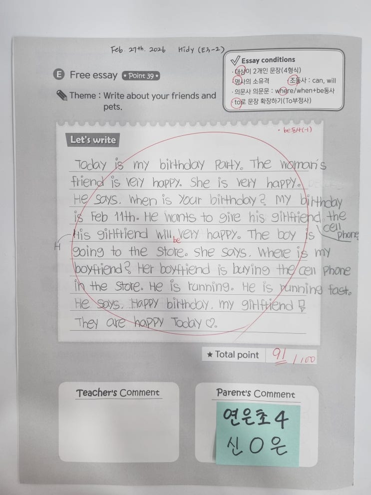 안녕하세요, 파로영어입니다. 에세이 풀세트 학습을 하는 친구들이 본인의 영작실력을 뽐낼 수 있는 Free Essay(자유 영작) 과정이 교재가 끝날 때마다 진행되는데요! 파이널테스트 중 Free Essay 부문에서 잘 한 친구들을 각 반 별로 선발하여 매 달 수상하고 있습니다 Best Writers of February 이 달의 에세이 수상자들 (2월) 2월 이달의 에세이 명단 E3-2) 연은초 4 신0은(Hidy) E2-3) 연은초 5 조0주(Ivy) E2-2) 연은초 3 정0우(Justin) E1-4) 연은초 3 송0원(Jennie) E1-1) 연은초 2 송0아(Sia) E1-3) 연은초 5 김0현(Hazel) E1-4) 응암초 4 김0영(Tay) E1-5) 연은초 5 임0준(Joseph) E2-1) 연은초 3 정0율(Dora) E2-1) 연은초 5 조0준....... <img src="https://blogthumb.pstatic.net/MjAyNjAzMDNfMTEx/MDAxNzcyNTMwMTEzMTc3.JEQWHEh4hpwe3r1bePTXkxInf_QDldtksvf5GIbK3xcg.7k7Qj1EiFSFfgmX0Csuiro9w9_F_hN2KGCCFJSRGzlMg.JPEG/KakaoTalk_20260227_180820382.jpg?type=s3" />
