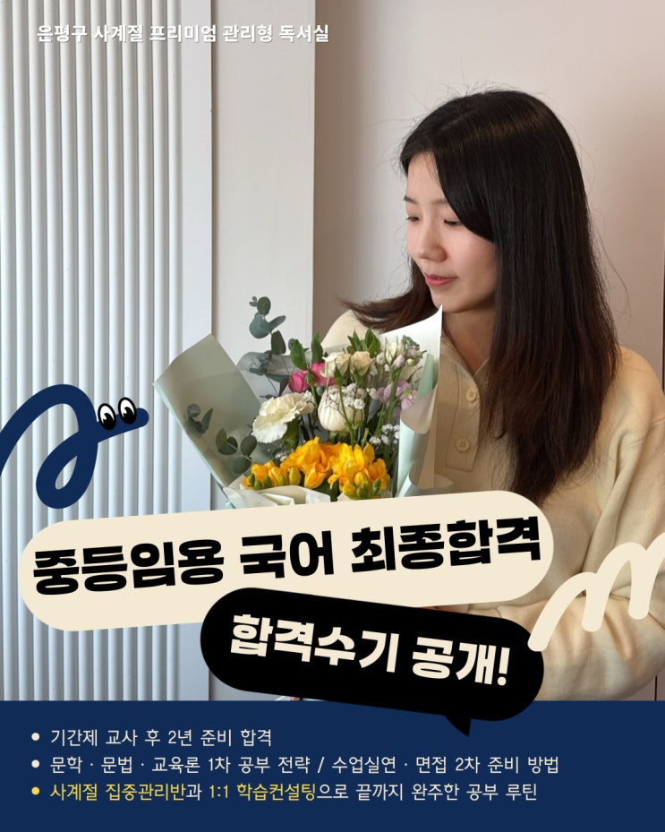 안녕하세요 :) 사계절 프리미엄 관리형 독서실입니다. 이번 글은 중등임용 국어 합격수기입니다. 기간제 교사를 병행하며 약 2년 동안 임용고시를 준비해 합격한 수험생분의 공부방법을 정리했습니다. 요즘 사계절 관리형독서실에 반가운 합격 소식들이 연이어 이어지고 있는데요! 성인관리반 그리고 학생관리반 모두 합격소식이 있기에 차례로 합격수기 전해드릴 예정입니다 지현님께서는 사계절 집중관리반에서 개인맞춤 1:1 planb 학습컨설팅까지 지속적으로 참여하셨고, 당연히 수험중에 힘들 때도 있었지만, 포기하지 않고 하루하루를 묵묵히 공부하셨습니다. 임용고시 각 과목별 준비방법, 노하우, 멘탈 관리법, 슬럼프 극복방법....... <img src="https://blogthumb.pstatic.net/MjAyNjAzMDdfMjY5/MDAxNzcyODg5OTQyODc4.3IO9tLYmCaJvjTvPvUruQMIuhV4vLlpPsf7GfQtZ1Pog.Ik4UbL5-X9lwMhiX_z-83UXOyNt3F-uGChgO9Fzi6dog.JPEG/%C7%D5%B0%DD%BC%F6%B1%E2_%C0%CE%BD%BA%C5%B8%BF%EB-001_%287%29.jpg?type=s3" />