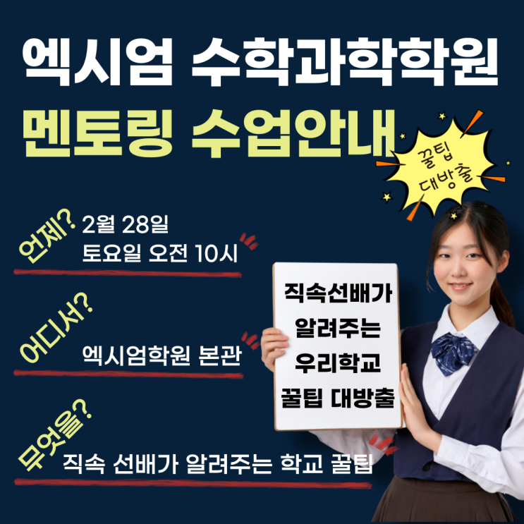 예비고1 대상 멘토링 수업 안내 “각 학교 직속 선배가 알려주는 학교 생활 꿀팁” 안녕하세요. 엑시엄수학과학학원입니다. 학교 생활에 대해 가장 깊이 이해하고 있는 사람은 누구일까요? 학원 원장일까요, 입시 컨설턴트일까요? 물론 전문가의 분석도 중요합니다. 하지만 실제 학교의 분위기, 시험 유형, 수행평가 방식, 동아리 활동과 선생님 스타일 등 가장 현실적인 정보를 알고 있는 사람은 바로 그 학교를 직접 경험하고 있는 성적 우수 선배일 것입니다. 이러한 이유로 엑시엄에서는 매년 설렘과 긴장 속에 고등학교 입학을 앞둔 예비고1 학생들을 위해 학교별 직속 선배 멘토링 수업을 진행하고 있습니다. 올해도 입학 전 선배와의....... <img src="https://blogthumb.pstatic.net/MjAyNjAyMjBfMjY0/MDAxNzcxNTkxODc0MTA1.iN4J7pGYpP3T-h964qIvmlLMNp97SXT3IRIitcXkeVsg.PDVeL3AK-eptwe4Q470iP5gCoYydLo3x0LKohB98qgUg.PNG/%C1%A6%B8%F1%C0%BB-%C0%D4%B7%C2%C7%D8%C1%D6%BC%BC%BF%E4_-001_%2821%29.png?type=s3" />