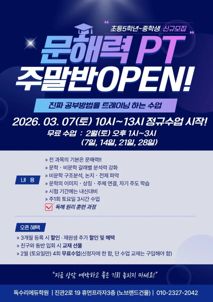 새학기가 시작되는 3월은 아이들의 학습 방향을 다시 세우는 가장 중요한 시기입니다. 특히 수학은 ✔ 한 번 놓치면 따라가기 어렵고 ✔ 기초가 흔들리면 학년이 올라갈수록 더 힘들어지는 과목입니다. 그래서 많은 학부모님들께서 “이번 학기에는 제대로 잡아주고 싶다”는 마음으로 상담 문의를 주고 계십니다. 왜 새학기 수학이 중요할까요? ✔ 새 단원 시작 = 격차가 벌어지기 전 마지막 기회 ✔ 중간·기말 내신의 방향을 결정하는 1학기 ✔ 선행보다 더 중요한 ‘개념 완성’ 시기 위드제이학원은 단순 문제풀이가 아닌 개념 이해 → 유형 적용 → 반복 훈련 → 오답 관리까지 체계적인 수업으로 아이들이 “스스로 풀 수 있는 힘....... <img src="https://blogthumb.pstatic.net/MjAyNjAyMTNfMTUz/MDAxNzcwOTY2NzM5ODI4.zcifA2j4g-kNTx_j04nhCxCkavX5lW-BRmF_qgHFJ9Ug.NcTr6lvtvbGGoQkiM1Njf0qmydGxuMZaG6XYT3cG-OMg.PNG/%C1%A6%B8%F1%C0%BB_%C0%D4%B7%C2%C7%D8%C1%D6%BC%BC%BF%E4._%284%29.png?type=s3" />