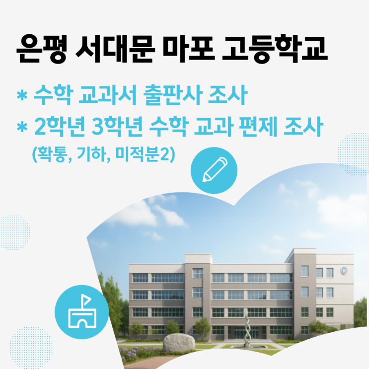 은평구 서대문구 마포구 주요 고등학교 수학교과서 출판사 학교 내신 지필평가 대비에서 “교과서 출판사 + 선택과목 이수 학년” 조사는 기본입니다. 학교 내신 지필평가에 제대로 대비하려면 단순히 문제를 많이 푸는 것만으로는 부족합니다. 각 학교가 사용하는 수학 교과서 출판사를 정확히 파악하고, 또한 확률과통계,기하,미적분2를 어느 학년에 이수하는지까지 알고 있어야 내신 대비가 가능합니다. 엑시엄수학과학학원에서는 은평구,서대문구,마포구 주요 고등학교의 수학 교과서 출판사와 학년별 선택과목 편성 흐름을 사전에 조사하여 학생들의 내신 대비에 빈틈이 없도록 준비하고자 합니다. 아래 표를 참고하시어 학교별 내신 대....... <img src="https://blogthumb.pstatic.net/MjAyNjAyMTdfMzUg/MDAxNzcxMjk5NTc2NDg5.vaI0LriS-_Dc4RiWPP5bbode22nqa6GzJqRp8LZH3oMg.zk3sDGDiY1sVNxnXDFCs4HFr9P3q16kIjumHU1w4T64g.PNG/%C1%A6%B8%F1%C0%BB-%C0%D4%B7%C2%C7%D8%C1%D6%BC%BC%BF%E4_-001_%2817%29.png?type=s3" />