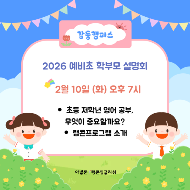 안녕하세요 강동에서 관리가 제일 꼼꼼한 초중등 영어학원 아발론랭콘 강동캠퍼스입니다. 아발론랭콘 강동캠퍼스에서는 봄학기를 맞아 입학설명회 일정을 준비했습니다. 강동 아발론랭콘과 함께 올바른 영어 학습의 시작을 준비해 보세요. 귀한 시간 내어 설명회에 참석해 주시는 학부모님께는 깜짝 특전을 드립니다. 2026 아발론랭콘 강동캠퍼스 예비초 학부모 영어설명회 OPEN 예비초 설명회 2/10(화) 7시 마감 임박! “우리 아이 영어, 어디서 어떻게 시작해야 할까요?” 초등 입학 전, 영어의 첫 기준을 제대로 세우는 것이 가장 중요합니다. 랭콘 강동캠퍼스는 초등 저학년 전문 영어교육을 바탕으로 부모님들이 가장 궁금해하는 ‘바른....... <img src="https://blogthumb.pstatic.net/MjAyNjAxMjlfMTU4/MDAxNzY5NjgwMjYyNDMx.58y7cWbYgDciedv6LzyQooXil5YmMlFvQBVLF4tBrqIg.wPk5FvctH7KTYGHnrr7J8Yk2kECOeJ9YhhXpf3nIhlog.PNG/%B8%ED%C0%CF%B5%BF_%BF%B5%BE%EE%C7%D0%BF%F8-002_%281%29.png?type=s3" />