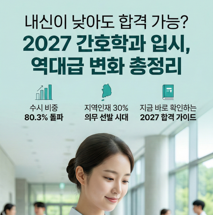 (feat. 내신 1~5등급별 합격 루트 총정리) 안녕하세요! 간호사를 꿈꾸는 수험생 여러분~ ⚕️⚕️ 오늘은 2027학년도 입시를 준비하는 여러분을 위해 **'언니가 알려주는 간호학과 합격 치트키'**를 준비했어요! 복잡한 입시 요강 때문에 머리 아팠던 친구들 모두 주목! ✨ 지금부터 아주 쉽고 시원하게 핵심만 콕콕 집어드릴게요. CHAPTER 1. 2027학년도 입시, 판이 바뀌었다? 올해 입시의 가장 큰 특징은 바로 **'수시 올인'**이에요. 전체 선발 인원의 무려 **80.3%**를 수시에서 선발한답니다! 반대로 정시는 **19.7%**로 줄어들었으니, 이제 수시 준비는 선택이 아닌 필수겠죠? 특히 비수도권 대학들은 수....... <img src="https://blogthumb.pstatic.net/MjAyNjAyMjhfMTAy/MDAxNzcyMjA1MzMyMDUx.Ns6UiGhNm-PMVebOLP1fzxcpJyUe6aTj9oxCxdv17fEg._dchP-EXWCQnCz-djqILy0Squ2JyqTalUf6Yhq9qhjsg.PNG/Gemini_Generated_Image_b1mzvhb1mzvhb1mz.png?type=s3" />