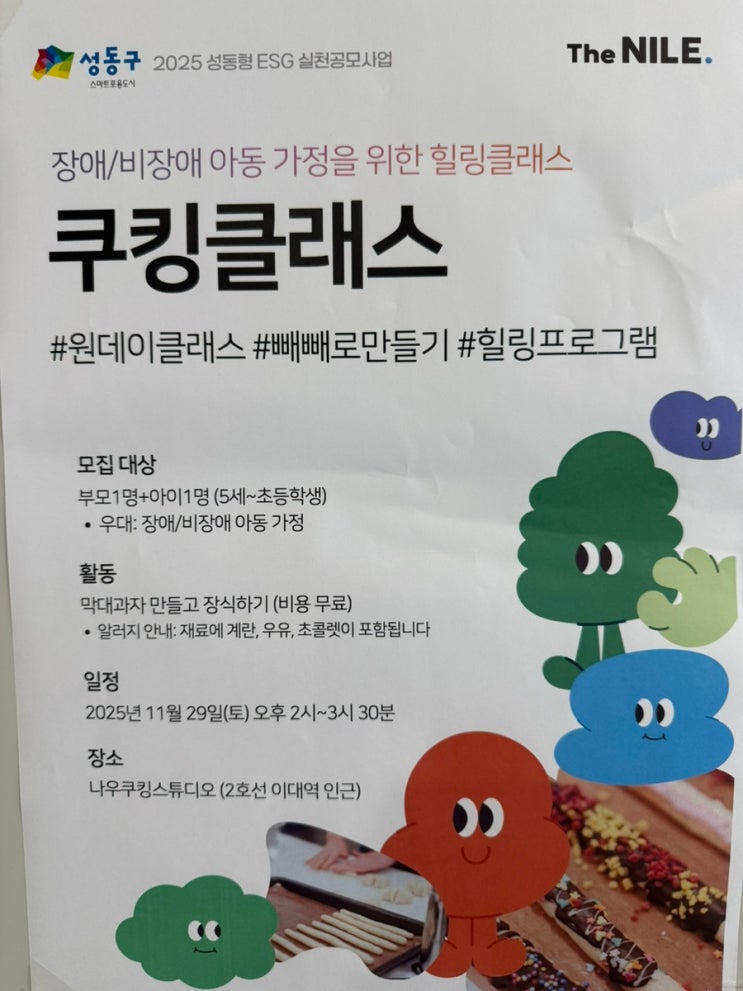 다양한 요리프로그램을 맞춤으로 진행해주고 있는 나우쿠킹입니다. 이번 내용은 장애/비장애 아동 가정을 위한 힐링클래스로 저희 나우쿠킹스튜디오에서 막대과자 만들기 베이킹 클래스 내용이에요 다양한 기관, 단체의 쿠킹 클래스를 하고 있지만 이번 프로그램도 뜻깊고, 행복한 순간이었습니다. 참여해주신 모든 분들이 너무 즐거워 하시고, 호응도 너무 좋아서 모든 것이 아쉬움 없는 그런 시간이었습니다. 아이들과 부모님, 보호자분들이 함께하는 시간으로 막대과자를 직접 반죽하고, 한 덩어리로 만들고, 나누고, 밀어서 길죽하게 만든후 오븐에 굽기, 식혀서 녹인 초코렛을 뿌려주고 스프링클을 이용해 뿌려주고, 굳혀서 포장까지! 모든....... <img src="https://blogthumb.pstatic.net/MjAyNTEyMTJfMTgy/MDAxNzY1NTI0MjM4NzYw.G8Oo_IB-llX07gSRTd8sYY311pTVeoPmE2OIwKxNcpog.uUHbNYHYkE-ittDJO9cMLOmCzGCn1X3L509sFXT_6y8g.JPEG/IMG%A3%DF7338.jpg?type=s3" />