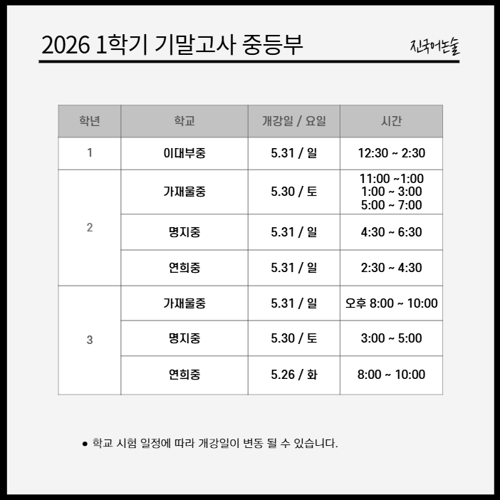● 중1,2 : 학교 교과서(출판사,저자 확인)에 맞는 '자습서' 준비하시면 됩니다. ● 중3 : 자체 교재를 사용 할 예정입니다. ● 시험 전 수업을 포함하여 5~6회 수업 예정입니다. ● 10명 정원 / 인원에 따라100~120분 수업 진행합니다. ● 5월 첫 주 연휴 끝나고 기말 내신 대비 시작 합니다. ● 고3은 수능 대비 수업만 진행합니다. <img src="https://blogthumb.pstatic.net/MjAyNjA0MjhfMjY2/MDAxNzc3MzQ3NTcxNzUz.WEMCPKT5skhzNAHRNzGxgPi9D6PXtNBYcEEPYRKaiOgg.lGeWJdkMXYOCN84VWxsqKGrRnToTyyrl90-_3gLIVsYg.PNG/1777347559061.png?type=s3" />