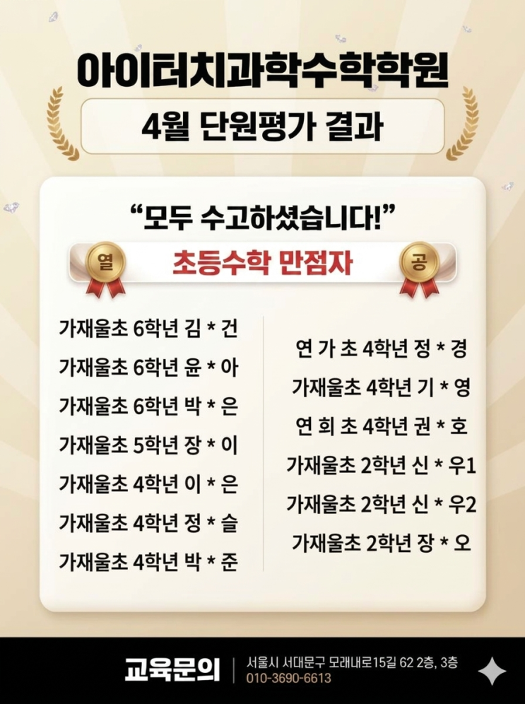 안녕하세요? 아이터치과학수학학원입니다. 중/고등학생들의 시험점수(백점)만 공지했더니, 초등학생들이 본인들의 점수도 자랑해 달라고 의견(?)이 들어와서 이번달 부터는 가끔 초등학교 학생들의 학교에서 진행한 단원평가 점수도 올리겠습니다^^ 열심히 공부한 학생들 칭찬합니다^^ <img src="https://blogthumb.pstatic.net/MjAyNjA0MjhfNDYg/MDAxNzc3MzY4NTc2OTE1.k1AYR6gbt3SQNy4oCBDrrdNDy5mUFYEjRnk5JZgY27Eg.fvnLFODZlWw0DKZD4rxNnX4wul4WnEPuK9JtyENT59Ug.PNG/4%BF%F9_%C3%CA%B5%EE%BC%F6%C7%D0_%B8%B8%C1%A1%C0%DA.png?type=s3" />