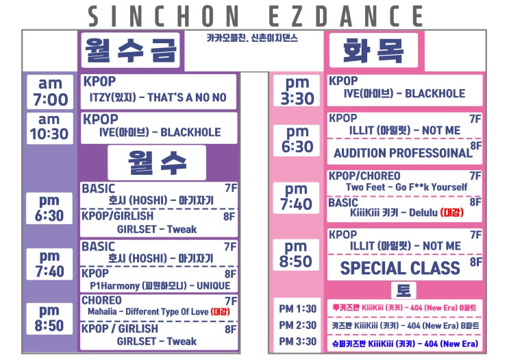 26년 3월 넷째주 수업 곡명 #피원하모니 #유니크 #방송댄스 배우기 안녕하세요! #랭키닷컴 1위 #댄스학원 #신촌이지댄스 입니다 :) 봄을 알리는 날씨와 함께 어느덧 3월도 마지막주를 앞두고 있는데요-!! 저희 #이지댄스신촌점 에서도 3월의 마무리를 활기차게 장식할 재밌는 수업곡명을 들고 찾아왔습니다! 식을 줄 모르는 열기의 #있지 #itzy #thatsanono #대추노노 !! 블랙홀 같은 매력의 #아이브 #ive #blackhole #블랙홀 , #세븐틴 #seventeen #호시 #hoshi 의 솔로곡 #아기자기 , #걸셋 #girlset 의 #tweak , #illit #아일릿 #notme , #kiiikiii #키키 의 #델룰루 #delulu , #키즈반 에서는 키키의 #404 가 진행됩니다! 핫한 #방송댄스 는....... <img src="https://blogthumb.pstatic.net/MjAyNjAzMjFfNzEg/MDAxNzc0MDY4OTYyMTc5.2Usn3FnSbFnftO4E_xOEmjHeeNY1LxEdNDnowEtcpWEg.q6ddrIKKnHHfGUDF6lQ6Vpskh-iGIj196vXg1DRVTFcg.JPEG/26%B3%E2-3%BF%F9-%B3%DD%C2%B0%C1%D6-%BC%F6%BE%F7%B0%EE%B8%ED.jpg?type=s3" />