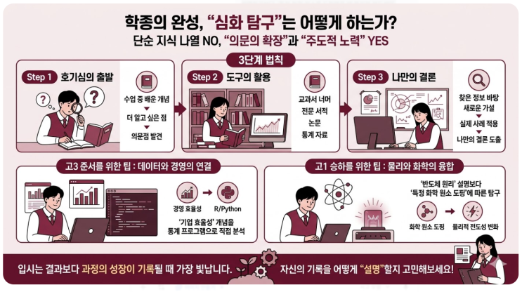 많은 학생이 "교과서에 나오는 내용을 보고서로 쓰면 심화 탐구인가요?"라고 묻는다. 하지만 대학이 원하는 심화는 단순히 지식을 나열하는 것이 아니라, '의문의 확장'과 '해결을 위한 주도적 노력'이다. 1. 심화 탐구의 3단계 법칙 Step 1. 호기심의 출발: 수업 시간에 배운 개념 중 더 알고 싶은 부분이나 의문점을 찾는다. Step 2. 도구의 활용: 교과서 수준을 넘어 전문 서적, 논문, 통계 자료 등을 찾아본다. Step 3. 나만의 결론: 찾은 정보를 바탕으로 새로운 가설을 세우거나 실제 사례에 적용해 본다. 2. 고3 준서를 위한 팁: 데이터와 경영의 연결 준서처럼 데이터 과학자를 꿈꾼다면 경영 과목에서 배....... <img src="https://blogthumb.pstatic.net/MjAyNjAzMjFfOTcg/MDAxNzc0MDQ4MTgzMTk1.mk3NbsUec1dhtg4KC15XTsaMYK6kd706WyZkENCQN1Mg.XvjsaqS_dBmTHrjxAIgVG7kZGSSWhpxpJX89coP26wsg.PNG/image.png?type=s3" />