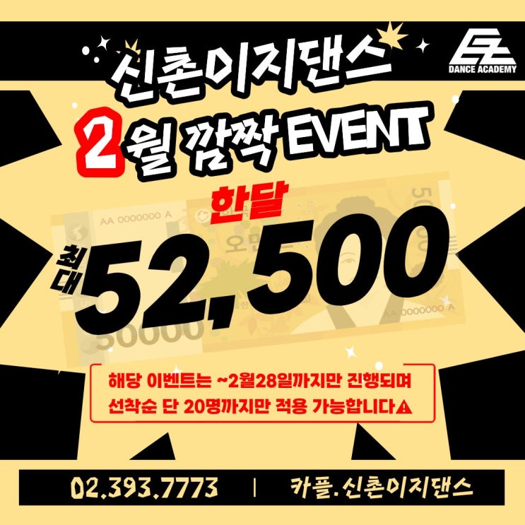 #홍대댄스학원 #이지댄스신촌점 2월 깜!짝! 한달 52,500원 #댄스학원이벤트 선착순 단 20명에게만⁉️ 안녕하세요! #랭키닷컴 1위 #댄스학원 홍대댄스학원 이지댄스신촌점 입니다:) 비상 ! 비상 ! 저희 #신촌이지댄스 에 2월 설이 지나고 갑작스레 찾아온 설프라이즈 깜.짝. EVENT-⚡ 바로바로 최대 한달 52,500원?!?! 마감 되지 않은 클래스에 한하여 한달 최대 52 ,500원으로 수강등록이 가능합니다! 해당 이벤트는 26년 2월중으로만 진행되며 , 선착순 ~20명까지!! 혜택을 받아가실 수 있습니다:) 홍대댄스학원 이지댄스신촌점에서 진행되는 깜짝 스페셜 이벤트로 설에 마음껏 먹었던 음식도- 마구마구 쌓였던 스트레스도- 다같이 날....... <img src="https://blogthumb.pstatic.net/MjAyNjAyMTlfMjgx/MDAxNzcxNDk4OTUzNzIy.wS1ZNTZaWRcBCC1DZLYu_spi9Q8ALIS1eLOqezoeDrgg.A9eFzDVVWeHcku21NuReTCeyUq8j5Ff55HAx9tA0e9og.JPEG/2%BF%F9_%B1%F4%C2%A6_%C0%CC%BA%A5%C6%AE%B4%D9.jpg?type=s3" />