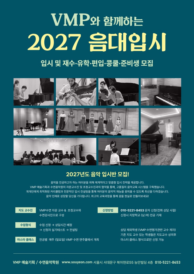 VMP와 함께하는 2027 음대입시 2027학년도 음악대학 입시를 준비하는 여러분을 위한 맞춤형 입시 프로그램을 모집합니다. 음악을 전공하고자 하는 학생들에게 체계적인 전략과 전문적인 지도를 제공하여 , 각자의 목표에 맞는 최상의 결과를 이끌어냅니다. VMP 예술기획과 수연음악학원의 교수진 및 초청 교수진이 함께하는 수준 높은 교육 시스템으로 여러분의 꿈을 현실로 만들어드립니다. ✔ 모집 대상 입시 · 재수 · 유학 · 편입 · 콩쿨 준비생 ✔ 수업 방식 상담 신청 → 상담 시간 배정 → 실기 테스트 → 맞춤 컨설팅 ✔ 지도 교수진 VMP 수연 자문 교수 & 초청 교수진, 수연강사진 ✔ 마스터 클래스 전공별 매주(일요일) V....... <img src="https://blogthumb.pstatic.net/MjAyNjAyMjBfMjA3/MDAxNzcxNTYxNzc0NTc5.RLBnf--MfBMZUG6F83nLrKuM2czI0G2Vx0uZqj3TFrIg._oUFTNo2cJPjv2CSR5D_RD7hLT_vdRToFiIeiJMapM4g.JPEG/KakaoTalk_20260220_132528824.jpg?type=s3" />