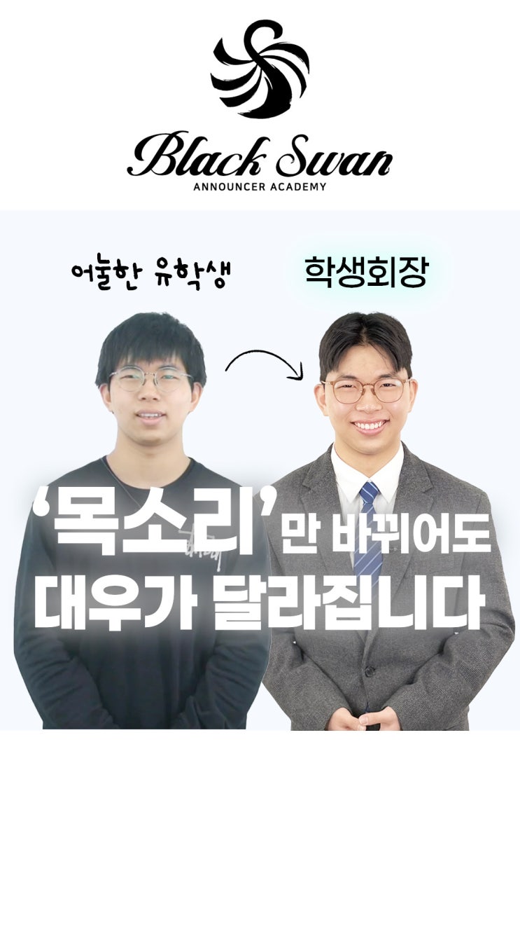 “유학생도 유창하게 말할 수 있다. 이미지 상승은 옵션” 말투가 어눌한가요? 이미지 변신을 도전하고 싶은가요? 한번쯤은 유창하게 말 한번 잘하고 싶은가요? 모든 고민은 블랙스완으로 오면 해결됩니다. 지금까지 온 일반인 보이스/스피치 클래스 수강생 만족도 99% 1%는 너무 거짓 같아서 뺐습니다. 만 4년이 지나고 나서는 확신을 가지고 이야기 합니다. “복식호흡, 발성, 발음” 3요소에 대해 루틴화한 후 보이스트레이닝과 서평수업을 연계해 스피치를 잘하게 만듭니다 더불어, 블랙스완스피치와 제휴된 업체를 통해 나에게 맞는 퍼스널 컬러, 헤어 메이크업, 그리고 의상까지 완벽하게 변신을 보장합니다. 대학생인데, 면접, 취업, 그리....... <img src="https://blogthumb.pstatic.net/MjAyNjAyMjBfMzAw/MDAxNzcxNTU1NTE5MTY4.vq6x2pVsZ1pDHCvxr3adQ4Dky6QamsreDqqbDLoFZxog.fCcs8OjXUSJFnmv0B9-H_O4yIJogTNgbjxdW1OTsSK8g.JPEG/%25EC%2584%25B8%25EB%25A1%259C.jpg?type=s3" />