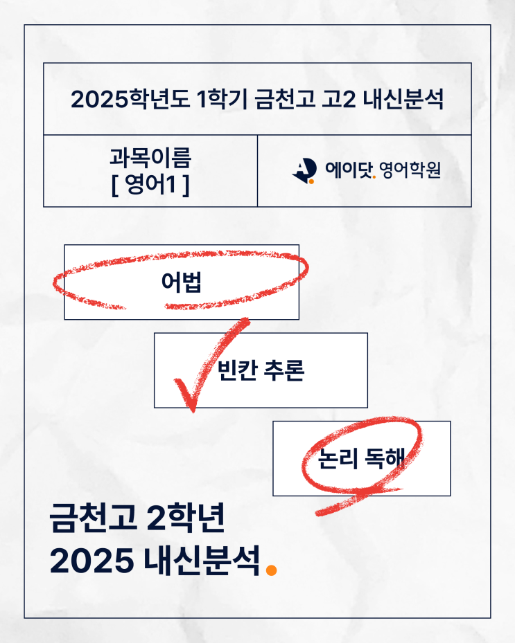 2025학년도 1학기 금천고 고2 영어 중간고사 내신 분석 이번 시험은 교과서뿐 아니라 모의고사 지문 비중이 높게 출제되며, 지문을 단순히 외우는 수준이 아니라 논리 구조와 문장 구조를 정확히 이해했는지 확인하는 시험이었습니다. 특히 어법과 빈칸 추론, 논리 독해 유형이 중심이 되면서 고2 수능형 독해 능력을 확인하는 시험이었습니다 모의고사 지문 비중이 가장 높은 시험이었습니다. 또한 외부지문도 15점 이상 배점이 포함되어 있어 절대 무시할 수 없는 비중을 차지했습니다. ➡️ 교과서 암기만으로는 고득점이 어려운 시험 구조였습니다. 이번 시험은 ✔ 교과서 암기 ✔ 모의고사 독해력 두 가지를 동시에 요구한 시험이라고....... <img src="https://blogthumb.pstatic.net/MjAyNjAzMDZfMzAg/MDAxNzcyODAwOTE0MjYw.FWG8Ps0iQcLY7ViWlqvYuNviW1TOlXeSwFOrssowA5Ig.3PHEbUdz7AFcBHRupgGRm8kuo15aSmFlnql6Afjmo6sg.PNG/%BF%A1%C0%CC%B4%E5-%B3%BB%BD%C5%BA%D0%BC%AE-%B1%DD%C3%B5%B0%ED-%B0%ED2.png?type=s3" />