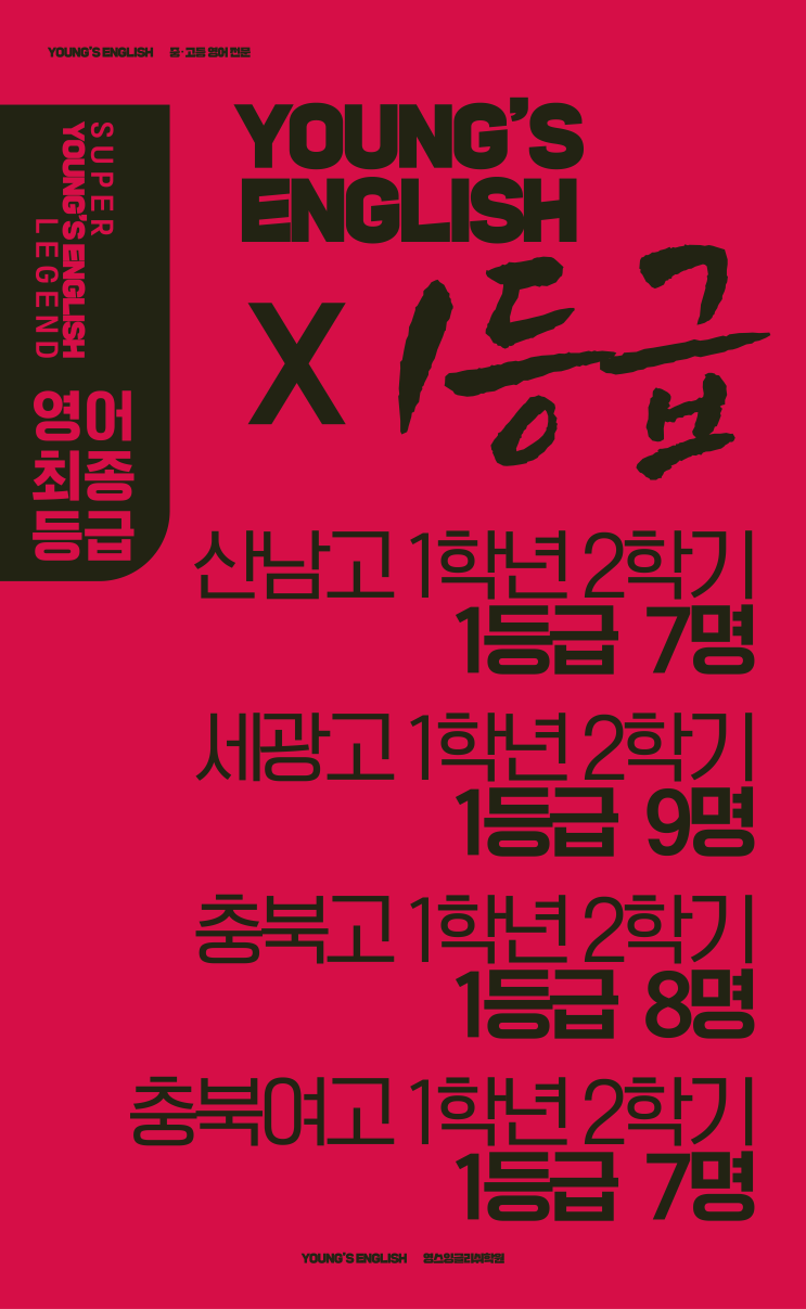 안녕하세요:) 영스잉글리쉬학원입니다. 지난 영어 내신 1등급 세광고 글에 연장선으로 산남고등학교, 세광고등학교, 충북고등학교, 충북여자고등학교 학생들이 [1학년 2학기 영어 최종 성적 1등급] 을 달성한 소식을 전해드립니다. 2025년 고1 2학기 영어 내신 산남고/세광고/충북고/충북여고 학생 1등급 고등학교 영어 내신 시험은 학교마다 시험 범위와 문제 유형이 모두 달라 학생들에게 결코 쉽지 않은 과정입니다. 그런 가운데 영스잉글리쉬학원에서 공부한 학생들이 고1 2학기 영어 내신에서 다수의 학생이 1등급 결과를 만들어냈습니다. 산남고등학교 7명 세광고등학교 9명 충북고등학교 8명 충북여자고등학교 7명 학생들의 꾸준한 노력과....... <img src="https://blogthumb.pstatic.net/MjAyNjAzMDRfMzcg/MDAxNzcyNjEwOTY0NDM1.JbfdnD35uL219caklKNPy8Tprl7SYr6-nGrhsgyPHpsg.xSqMEBu12nCKSpXCV5ktCWZNyA1GPeLkcDxl0A-viY4g.PNG/260303_%BC%BC%B1%A4%B0%ED2_%BF%DC_%BB%EA%B3%B2%B0%ED%2C_%C3%E6%BA%CF%B0%ED%2C_%C3%E6%BA%CF%BF%A9%B0%ED_1%B5%EE%B1%DE-01.png?type=s3" />