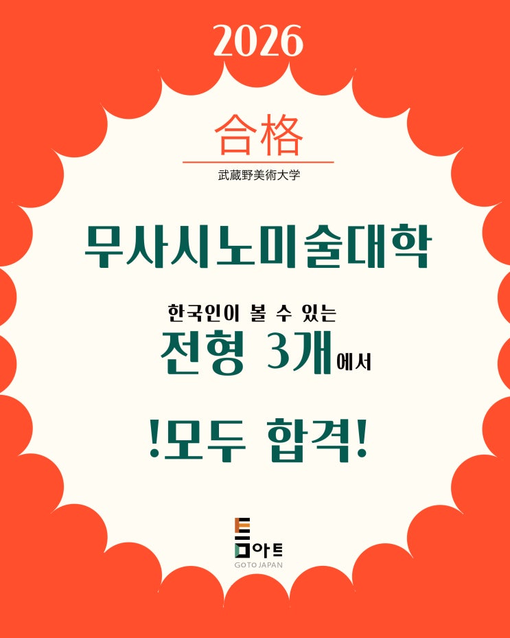 안녕하세요 일본미대 입시전문 틈아트미술학원입니다. 오늘은 26학년도 2월에 발표가 있었던 무사시노미술대학 일반전형에 합격함으로써 무사시노미술대학에서 한국인이 볼 수 있는 총 3가지의 전형에서 모두 합격자를 내었다는 소식을 가지고 왔습니다! 무사시노미술대학 안에서도 애니메이션, 영상, 다큐, 사진, 미디어아트 등을 다루는 무사시노미술대학 영상학과에 일반전형으로는 국내 최초로 합격하였습니다! 영상학과 일반전형에서는 감각테스트라는 일본어로 스토리를 적고, 그림을 함께 그려야 하는 실기시험과 연필뎃생 시험을 봐야했는데 일본인들을 제치고 합격하게 되었습니다>< 무사시노미술대학 입시유형 소개 일본미술대학....... <img src="https://blogthumb.pstatic.net/MjAyNjAyMjdfMTU0/MDAxNzcyMTk5NzA3MTY5.kX04Yk7nSxDRlLaCRRbfEnx7cUu0Q4nEsyz45IWEOHgg.lcTgfgOx8d3M4KmZ54yqiG8TsVR2Y3zFuNlKA5Hq1Gog.JPEG/25-26_%C0%CE%BD%BA%C5%B8_%B0%D4%BD%C3%B9%B0_0227.jpg?type=s3" />