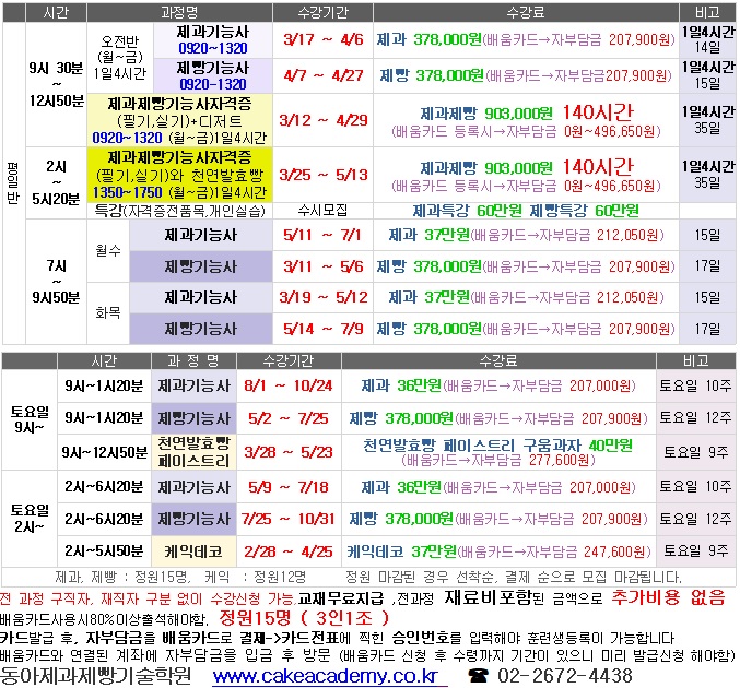 교육일정 및 수강료 현황-영등포제과제빵학원,제과제빵학원,동아제과제빵기술학원