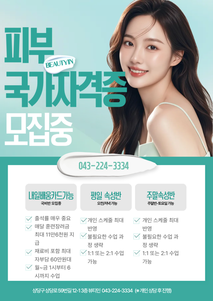 안녕하세요:) 뷰티인미용학원 청주캠퍼스점입니다. 피부국가자격증 취득을 고민하고 계셨다면, 이번 기회에 시작해보시는 건 어떠세요? 저희 뷰티인에서는 실무 중심 커리큘럼으로 누구나 도전할 수 있도록 도와드리고 있습니다. 현재 6월 개강반 모집 중이며, 체계적으로 준비할 수 있는 3개월 정규과정과 빠르게 취득을 목표로 하는 속성반(평일 / 주말)을 함께 운영하고 있습니다. 본인의 일정과 목표에 맞게 선택이 가능해서 직장인 분들이나 시간 활용이 필요한 분들도 부담 없이 시작하실 수 있습니다. 특히 내일배움카드 사용이 가능하여, 지원을 받으실 경우 40만원대 수강료로 합리적인 비용에 수강하실 수 있습니다. 비용 부담 때문에....... <img src="https://blogthumb.pstatic.net/MjAyNjAzMjZfOTUg/MDAxNzc0NTE3ODk1MDY3.EJk8sS0Oa9-dEqGvKD119z-OOOHQi4g1vAJ8JKPRtmcg.QtLnkc5ZUJdCi0Uhl6aaYA0Iw3PwEFnWb9KwnmKlqegg.PNG/KakaoTalk_20260304_111756731_01.png?type=s3" />