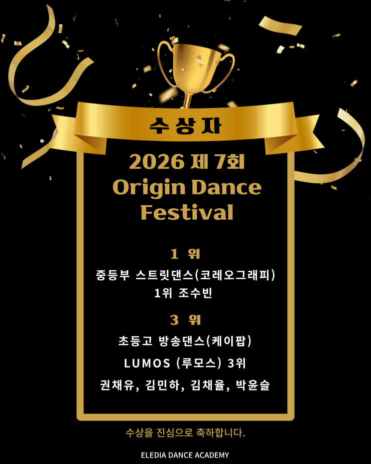 ✨ 청주댄스학원 추천 | 2026 Origin Dance Festival 수상 소식 안녕하세요 청주에서 아이들 춤 교육 고민 중이신 학부모님들께 반가운 소식 전해드려요! 이번에 저희 에르디아 댄스 학원 학생들이 2026 제7회 Origin Dance Festival에서 멋진 결과를 만들어냈습니다 대회 수상 결과 ✔ 중등부 스트릿댄스(걸스힙합) 1위 조수빈 ✔ 초등부 방송댄스(K-POP) 3위 LUMOS (루모스) 권채유, 김민하, 김채율, 박윤슬 청주에서 실력으로 증명하는 댄스학원 단순 취미가 아니라 기초부터 무대 경험까지 제대로 성장하는 수업 아이들이 직접 대회에 나가 성과를 만들어낸다는 건 커리큘....... <img src="https://blogthumb.pstatic.net/MjAyNjAzMzBfMTkw/MDAxNzc0ODQ3OTcxMzQ2.O_qM3FDAACkFc8Fe-Us8E_9Ow5zlyAqG0RnJBfG6K2Mg._0aQ9z12BkxenLoe-2ef5pvLbUj3iM4M93cOUCgF7RQg.PNG/22.png?type=s3" />