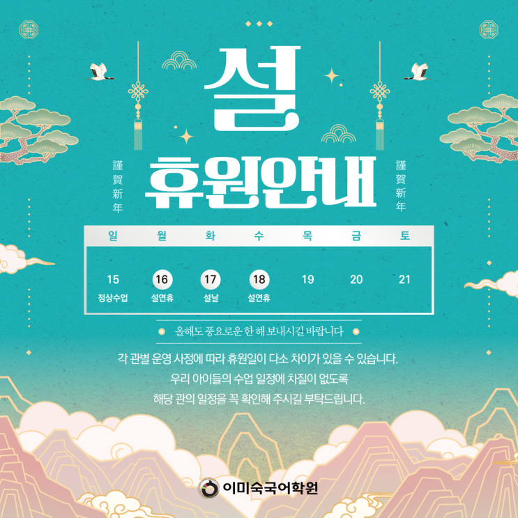 안녕하세요, 이미숙국어학원입니다. 어느덧 설날이 다가왔습니다. 2026년 새해를 맞이해 가정에 행복과 웃음이 가득하시길 진심으로 기원합니다. 연휴 기간 우리 학생들이 충분한 휴식과 재충전의 시간을 가질 수 있도록, 아래와 같이 휴원 일정을 안내드리오니 일정에 참고하시기 바랍니다. ※ 2/15일(일)은 정상 수업 진행합니다. 2026년 2월 16일(월) ~ 2월 18일(수)은 설 연휴로 인한 휴원입니다. 올해도 풍요롭고 건강한 설 연휴 보내시길 바랍니다! 각 관별 운영 사정에 따라 휴원일이 다소 차이가 있을 수 있습니다. 우리 아이들의 수업 일정에 차질이 없도록 해당 관의 일정을 꼭 확인해 주시길 부탁드립니다. 2/19 (목) 부터 정상 수업....... <img src="https://blogthumb.pstatic.net/MjAyNjAyMTRfMjMw/MDAxNzcxMDUwNjYyMDUx.W7Jz1WSVZUX3WOrBt_HhBYwpYLVz2NcEbKkY0BG3P1Ag.YA2lY6v0hEFVu08r3ePVx576Y2KoENCfirKAfcIX3gwg.PNG/%BC%B3%B3%AF_%C8%DE%BF%F8_%B0%F8%C1%F6.png?type=s3" />