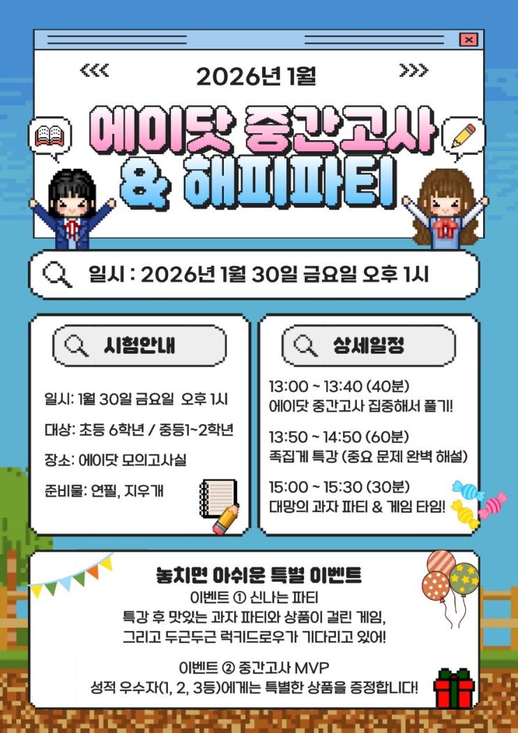 에이닷 영어학원 청주상당지점의 중간고사 및 해피 파티 매월 마지막 주 금요일 에이닷 영어학원의 특별한 하루 ✨ 에이닷 영어학원 청주상당지점에서는 매월 마지막 주 금요일, 아이들이 조금은 설레는 마음으로 학원에 올 수 있도록 학습 + 이벤트가 함께 있는 특별한 시간을 운영하고 있습니다 지난 1월 30일 금요일에는 에이닷 중간고사 & 해피 파티가 진행되었습니다! 아이들과 함께한 생생한 현장! 바로 보러 가볼까요? 1월 마지막 금요일, 이렇게 진행됐어요 이번 행사는 ✔️ 중간고사 ✔️ 족집게 특강 ✔️ 과자 파티 & 게임 세 가지가 자연스럽게 이어지는 구성으로 진행됐습니다. 먼저, 정해진 시....... <img src="https://blogthumb.pstatic.net/MjAyNjAyMDFfMTkw/MDAxNzY5OTU0MzM5NTMy.5lcTVPI8XePUMq2SKLLEE8WohXhhkjwb9bTUhxzUSYYg.78jLzQvQ9GrNOsO4vR79cx1Ky3t3T4eI8FGQDzGaCSwg.PNG/KakaoTalk_Photo_2026-02-01-22-35-42.png?type=s3" />