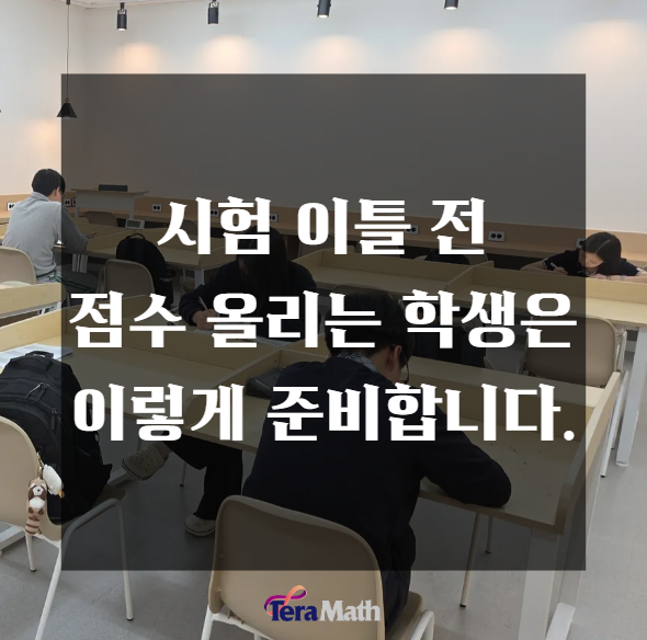 시험이 이틀 남았어요! 지금 바꿔도 점수가 달라질 수 있을지 고민이세요? 결론부터 말하면 충분히 가능해요. 안녕하세요. 동남지구 수학학원 테라매스입니다. 시험 직전은 새로운 걸 늘리는 시기가 아니에요. 오히려 아는 것을 확실히 내 것으로 만드는 '줄이고 정리하는 시기'랍니다. 그동안의 준비가 조금 부족했더라도 짧은 시간을 활용해 점수를 훌쩍 올리는 학생들을 보면 학습 방법이 조금 달라요. 테라매스가 그 비결을 살짝 공유할게요. 오답만 다시 그동안 틀린 문제를 그냥 눈으로만 보고 넘어가지 마세요. 풀이를 보고 이해했다고 끝내면 안 돼요. 빈 종이에 다시 풀어서 스스로 끝까지 풀리는지 꼭 확인해야 해요. 여기서....... <img src="https://blogthumb.pstatic.net/MjAyNjA0MjVfMjI0/MDAxNzc3MTIyNjg1NTQ5.XoG_DT4RrIXp3eFrfJiQGuTomeIr-aC_2qORhrZqmyAg.DfAMwrGgPO_nTozLg5xpmTqSkvxpz4Cobi25C_xl-TEg.PNG/image.png?type=s3" />