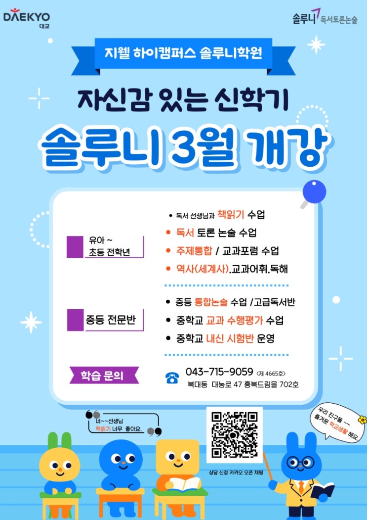3월 봄바람! 새학기 시작♡ 자신있는 신학기 공부 솔루니와 시작하세요!! 신학기 적응하는 우리 친구들 기특해요! 칭찬나무를 가꾸어 솔루니편의점에 맛있는 간식을 획득하세요!! 재미있는 삼행시 짓기!! 이제 본격적으로 시작♡ 출석, 지각하지 않아도 스티커 획득!! 푸짐한 선물 갖고가자~~~ 상담 예약 이벤트 진행중 카카오 오픈채팅 상담 신청 #새학기#신학기#솔밭초#예비초#복대동초등논술#복대동국어공부#솔밭초근처학원#국어어휘#초등국어#지웰솔루니#지웰솔루니학원#솔루니편의점#과자이벤트#칭찬나무#신학기공븐 <img src="https://blogthumb.pstatic.net/MjAyNjAzMDlfMTY4/MDAxNzczMDQyNDY5NjE3.oarqk8E5g35q_cddxf6da41PEbjrQTP41LOgxDt5Q0Ig.uyMnY2gxIqY19xaRXL8PjTLion-_OQl6DTSMxKaROWgg.JPEG/1772509610809.jpg?type=s3" />